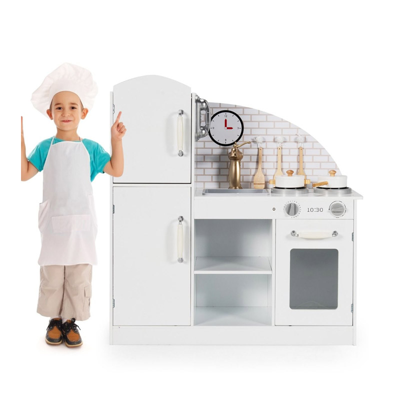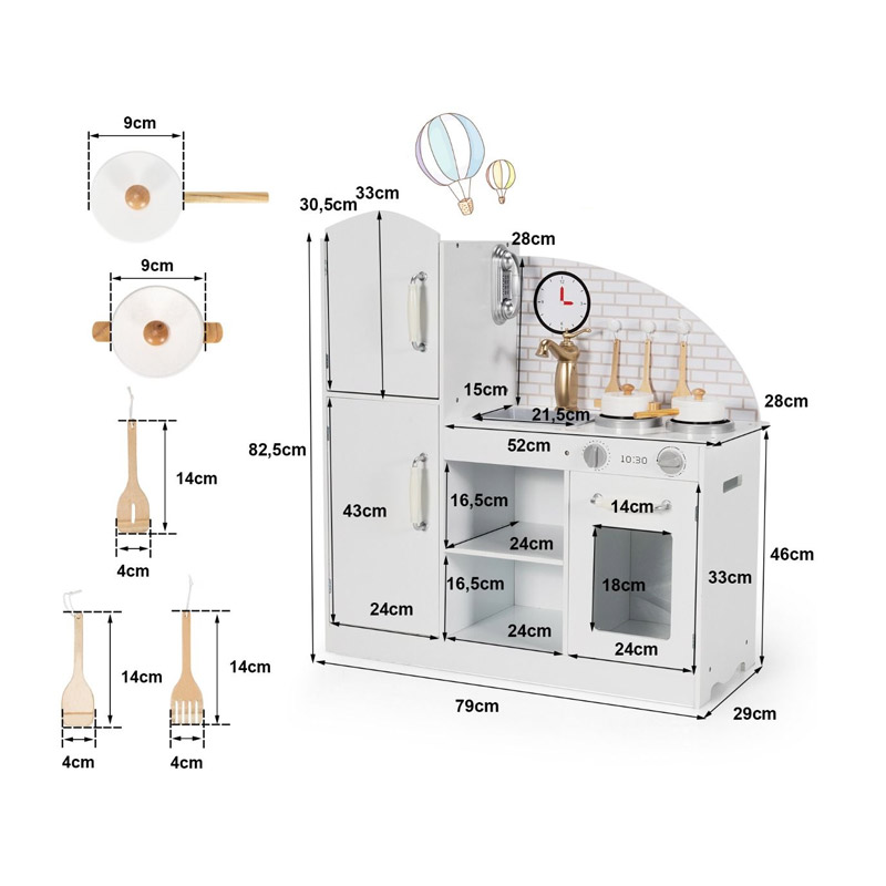 Διαθέτει πολλαπλούς αποθηκευτικούς χώρους, όπως ανοιχτό ράφι 2 επιπέδων και 2 μεγάλα ντουλάπια, προάγοντας αποτελεσματικά την οργανωτική ικανότητα του παιδιού σας. Επιπλέον, περιλαμβάνει 1 τηγάνι, 1 κατσαρόλα και 3 σπάτουλες, δίνοντας στα παιδιά την ευκαιρία να μάθουν πολλές βασικές μαγειρικές δεξιότητες.
