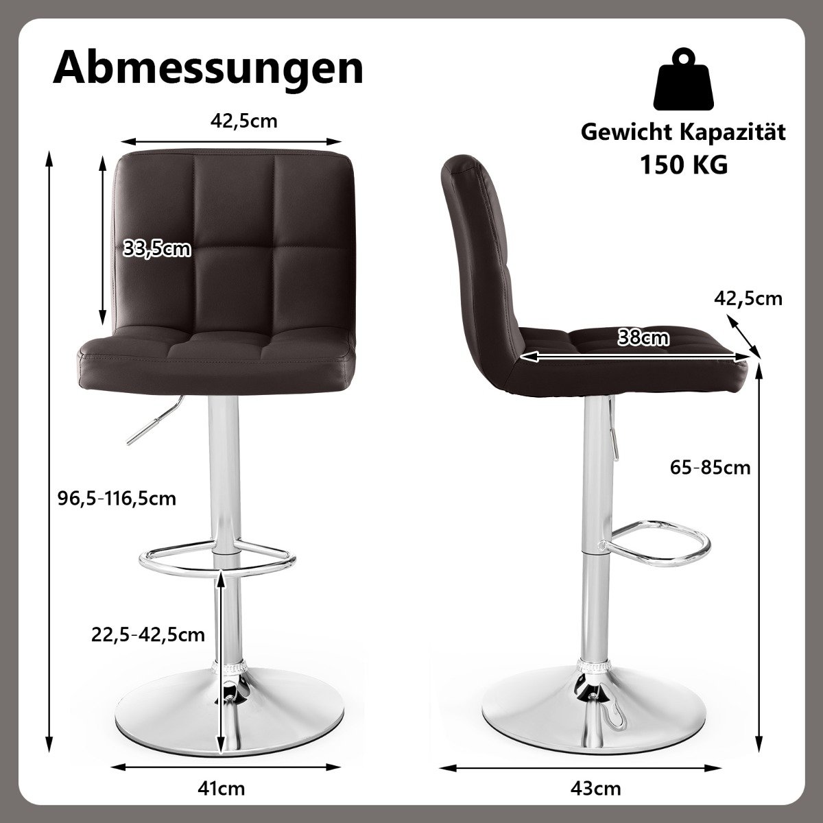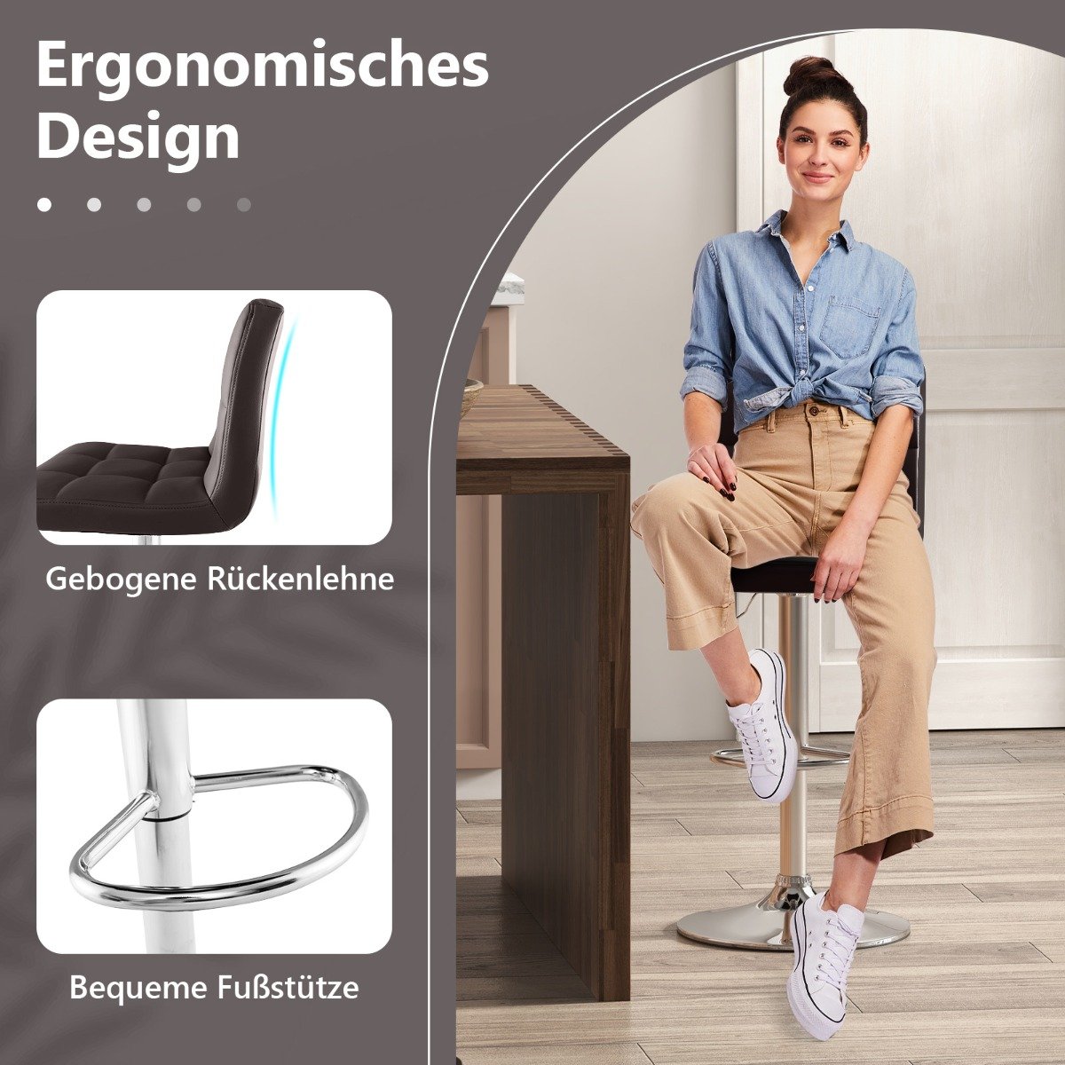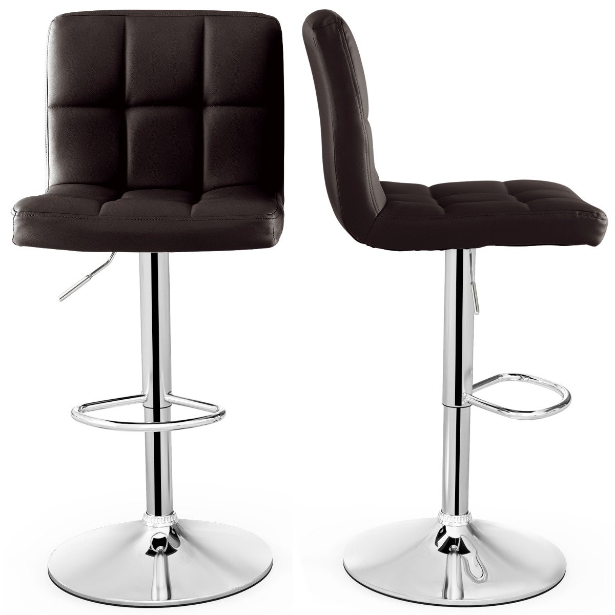 Απολαύστε ατομική άνεση με αυτό το σετ από 2 σκαμπό μπαρ. Με ρυθμιζόμενο ύψος καθίσματος από 65 cm έως 85 cm και περιστρεφόμενο κάθισμα 360°, μπορείτε εύκολα να βρείτε την ιδανική θέση καθίσματος. Απολαύστε πολυτελή άνεση με την κεκλιμένη πλάτη, το μαξιλαρωμένο κάθισμα και το υποπόδιο που μπορεί να μειώσει την πίεση στα πόδια για μεγαλύτερη διάρκεια καθίσματος. Τα σκαμπό μας είναι κατασκευασμένα από υψηλής ποιότητας τεχνητό δέρμα και άνετο σφουγγάρι. Ο σταθερός σκελετός τους αντέχει βάρος έως 150 kg και συμπληρώνεται από μια ευρεία μεταλλική βάση με αντιολισθητικό δακτύλιο από καουτσούκ, που εξασφαλίζει σταθερότητα και αποτρέπει την τυχαία ολίσθηση ή γρατζουνιές. Χάρη στις σαφείς οδηγίες, η εγκατάσταση είναι παιχνιδάκι. Μετατρέψτε το μπαρ του σπιτιού σας, την κουζίνα, το εστιατόριο, την παμπ ή το καφέ σας σε έναν χώρο άνεσης για τους καλεσμένους σας με αυτό το ευέλικτο και κομψό σετ σκαμπό μπαρ.