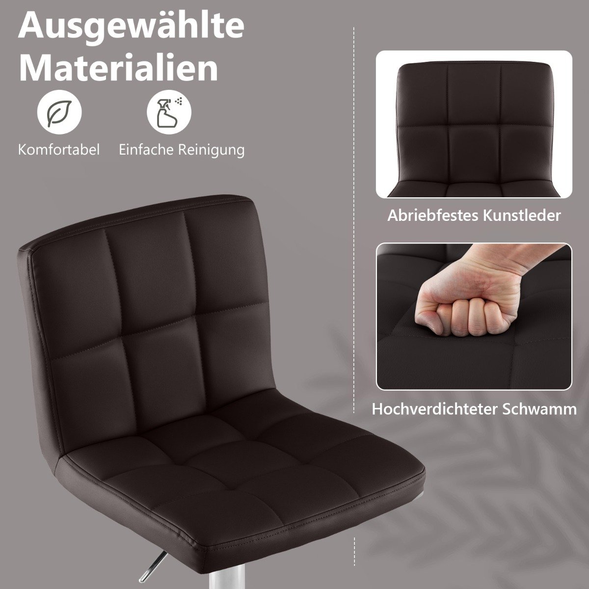 - Άνετα και ανθεκτικά υλικά: Για απαλή αίσθηση, κάθε σκαμπό περιέχει σφουγγάρι για μέγιστη άνεση. Επιπλέον, το σκαμπό είναι επενδυμένο με φιλικό προς το δέρμα τεχνητό δέρμα, που είναι αδιάβροχο, ανθεκτικό στο φως και στη φθορά και εύκολο στη συντήρηση.