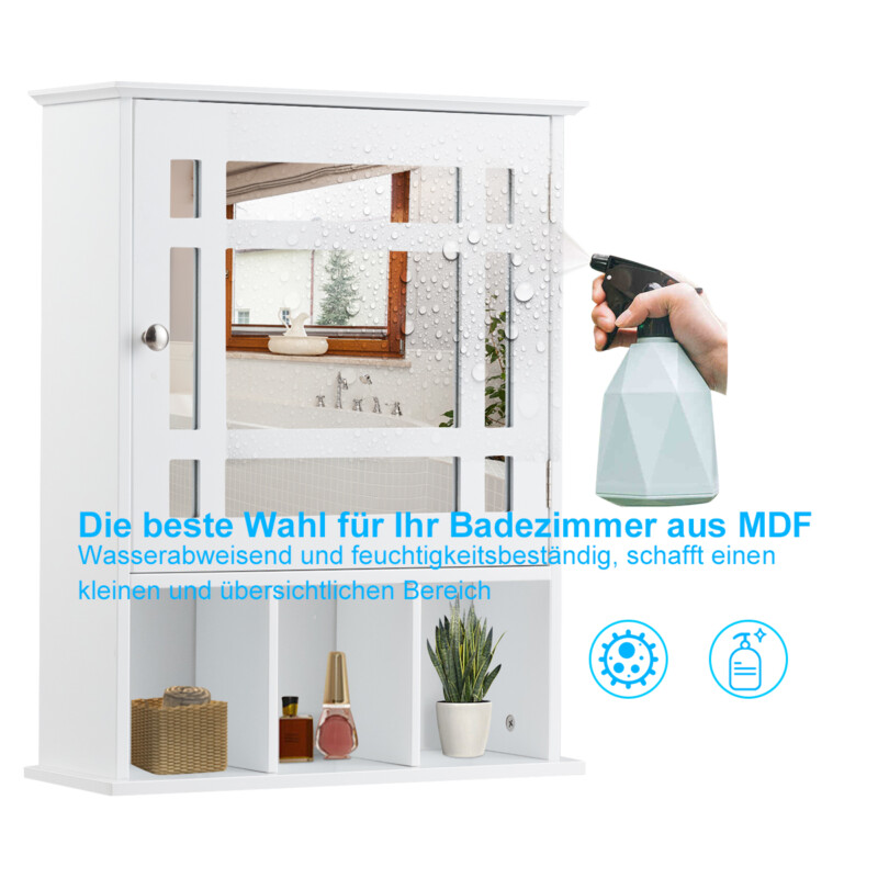 Η μονόφυλλη ντουλάπα καθρέφτης μας φέρνει τάξη και κομψότητα στην καθημερινότητά σας. Αποτελείται από υψηλής ποιότητας MDF με φιλική προς το περιβάλλον, λευκή βαφή, είναι ανθεκτική στο νερό και την υγρασία, καθιστώντας την ιδανική για χρήση σε χώρους με υψηλή υγρασία. Το ράφι μπορεί να προσαρμοστεί σε 3 διαφορετικά ύψη ανάλογα με τις ανάγκες, ενώ τα ανοιχτά ράφια σας προσφέρουν έναν πρακτικό χώρο αποθήκευσης για καθημερινά χρησιμοποιούμενα αντικείμενα. Χάρη στον απλό και μοντέρνο σχεδιασμό του, μπορεί να ενσωματωθεί εύκολα σε διάφορα στυλ διακόσμησης.