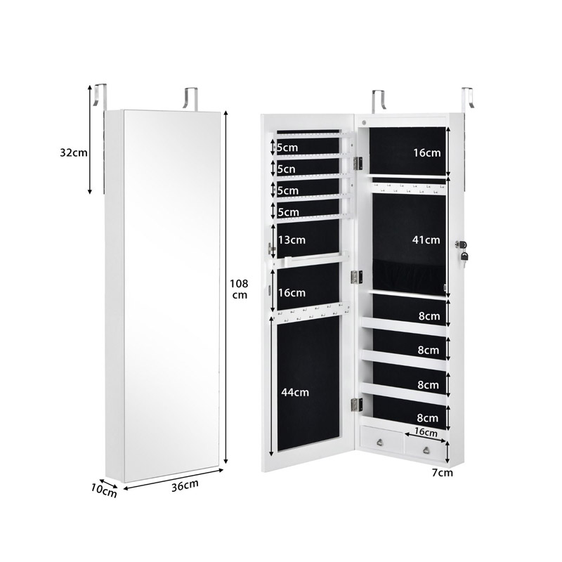 Η κοσμηματοθήκη – μπιζουτιέρα, από την εταιρία Costway, είναι κατασκευασμένη από MDF υψηλής ποιότητας. Σας παρέχει 24 γάντζους για κολιέ, 100 υποδοχές για σκουλαρίκια, 30 τρύπες για σκουλαρίκια, 1 μπάρα μπρασελέ και 78 υποδοχές για δαχτυλίδια, επιτρέποντάς σας να αποθηκεύετε τα κοσμήματά σας τακτοποιημένα. Καλλυντικά, γυαλιά ηλίου, ρολόγια μπορούν να αποθηκευτούν στα 4 ράφια, στα 2 συρτάρια και στη 1 βελούδινη τσάντα. 6 φώτα LED που ανάβουν και σβήνουν αυτόματα εξασφαλίζουν βέλτιστο φωτισμό.