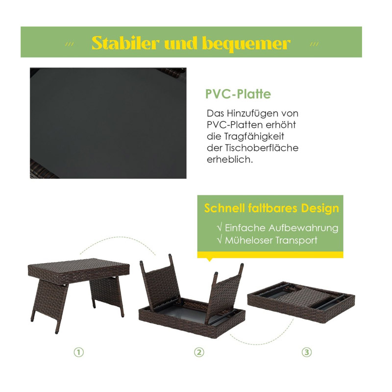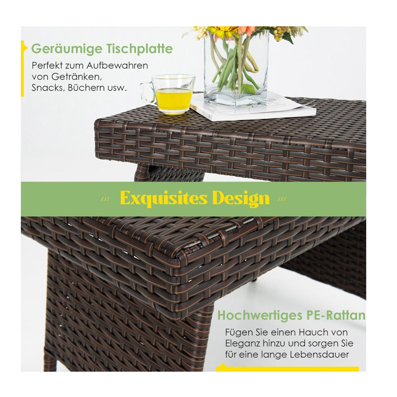 Το τραπέζι εξωτερικού χώρου, από την εταιρία Costway, διαθέτει πλαίσιο από συμπαγές ατσάλι καλύπτεται με ανθεκτικό rattan PE. Το υψηλής ποιότητας rattan είναι ανθεκτικό στις καιρικές συνθήκες, έτσι το τραπέζι μπορεί να χρησιμοποιηθεί σε εξωτερικούς χώρους για μεγάλο χρονικό διάστημα. Ένα στιβαρό πάνελ PVC εγγυάται χωρητικότητα φόρτωσης έως 45 Kg.