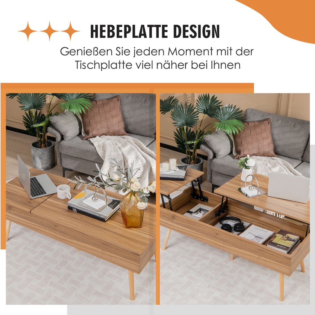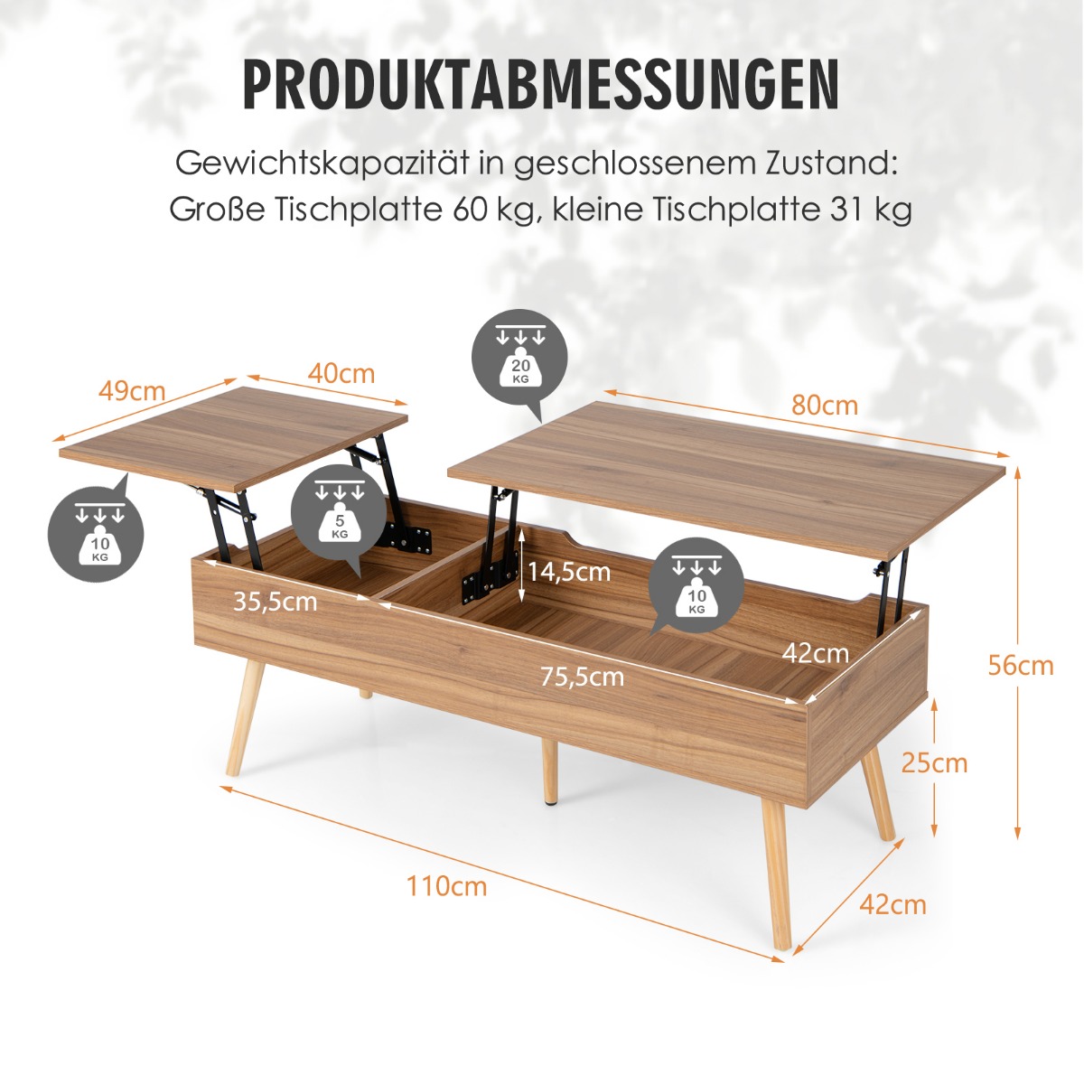 Πρέπει συχνά να σκύβετε προς τα εμπρός για να φτάσετε σε ένα φλιτζάνι στο τραπεζάκι του καναπέ; Τότε αυτό το τραπεζάκι με ανυψούμενη επιφάνεια σας προσφέρει έναν πιο διακριτικό τρόπο! Ακόμα πιο σημαντικό είναι ότι οι 2 χωριστές επιφάνειες του τραπεζιού μπορούν να κινηθούν σε 2 κατευθύνσεις, προσφέροντας άνεση σε εσάς και την οικογένειά σας που κάθεστε σε διαφορετικές θέσεις. Επιπλέον, χρησιμοποιείται ένας ανώτερος πνευματικός μηχανισμός για ομαλή και σταθερή ανύψωση. Δεν χρειάζεται να ανησυχείτε για τυχόν παγιδευμένα χέρια, καθώς είναι πολύ πιο ασφαλές από ένα σύστημα ελατηρίων και διαθέτει πλευρικές αυλακώσεις για την αποφυγή πιθανών κινδύνων. Εκτός από την ανυψούμενη επιφάνεια, το τραπεζάκι προσφέρει επίσης άφθονο αποθηκευτικό χώρο που βοηθά να κρύψετε την ακαταστασία από τα μάτια σας. Επιπλέον, τα 5 πόδια στήριξης συμβάλλουν σε μια αξιόπιστη κατασκευή και αφήνουν αρκετό ελεύθερο χώρο για καθαρισμό. Παρακαλώ θυμηθείτε να μην τοποθετείτε αντικείμενα στην επιφάνεια κατά την ανύψωση.