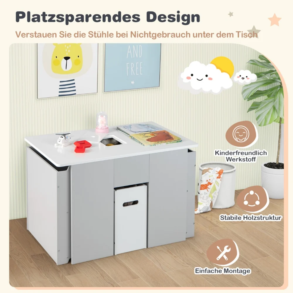 Προσφέρετε στα παιδιά έναν χώρο παιχνιδιού για ατελείωτη διασκέδαση με το 4-σε-1 σετ τραπεζιού και καρεκλών για παιδιά! Συνήθως, το τραπέζι και οι δύο καρέκλες χρησιμοποιούνται μαζί ως σετ. Ωστόσο, μπορείτε να χρησιμοποιήσετε τις δύο καρέκλες ξεχωριστά, καθώς μπορούν να στοιβαχτούν και να μετατραπούν σε ένα 4-επίπεδο ντουλάπι αποθήκευσης. Επιπλέον, μπορείτε να αφαιρέσετε το καπάκι από την επιφάνεια του τραπεζιού και να τραβήξετε το δοχείο κάτω από το τραπέζι για να αυξήσετε τον αποθηκευτικό χώρο. Οι ασφαλείς και στρογγυλεμένες γωνίες προστατεύουν το ευαίσθητο δέρμα των παιδιών. Ο ευέλικτος σχεδιασμός καλύπτει τις ανάγκες των μικρών παιδιών για παιχνίδι, ζωγραφική, μάθηση, φαγητό κ.λπ. Αν τα παιδιά σας δεν χρειάζονται τις καρέκλες, μπορείτε να τις σπρώξετε κάτω από την επιφάνεια του τραπεζιού για εξοικονόμηση χώρου. Και οι λαβές κοπής προσφέρουν μεγάλη άνεση κατά τη μετακίνηση. Αυτό το σετ είναι η τέλεια ιδέα δώρου για παιδιά άνω των 3 ετών.