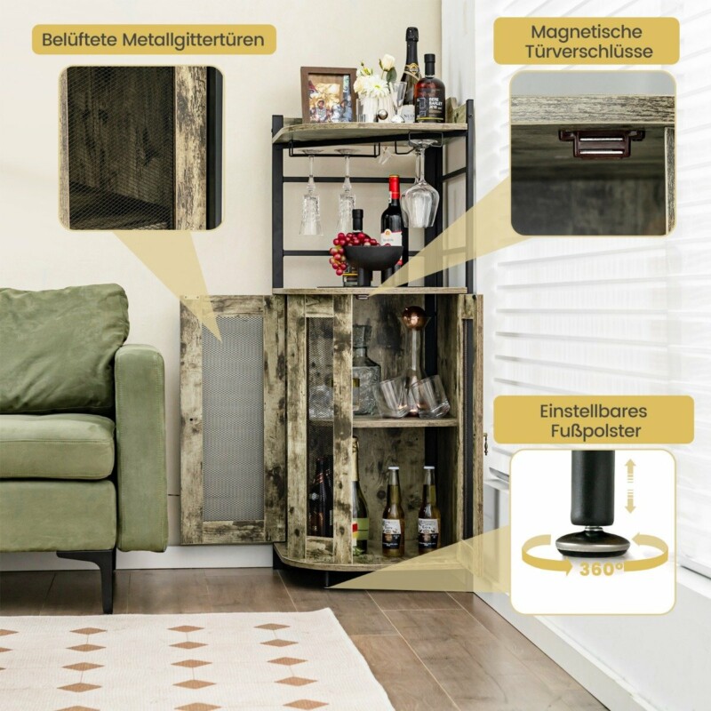 - Πολλαπλές επιλογές αποθήκευσης: Το γωνιακό ντουλάπι προσφέρει 2 σειρές βάσεις για ποτήρια κρασιού, ένα επάνω ράφι, μια ευρεία επιφάνεια εργασίας και 2 εσωτερικά ράφια για να καλύψουν τις ανάγκες σας. Η μεσαία εσωτερική ράφι μπορεί να ρυθμιστεί σε τρεις θέσεις για προσαρμοσμένο ύψος.