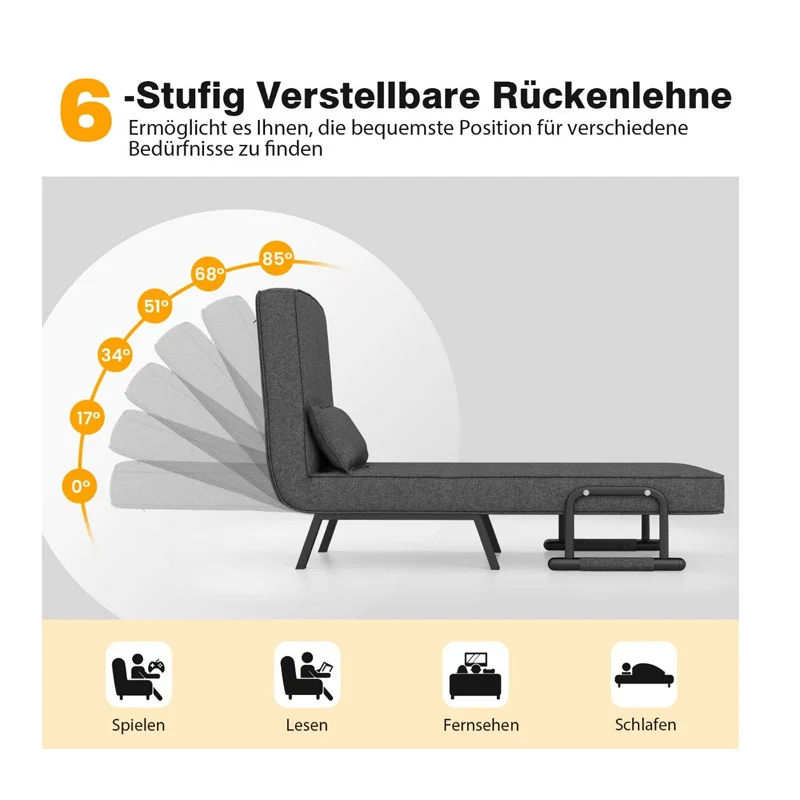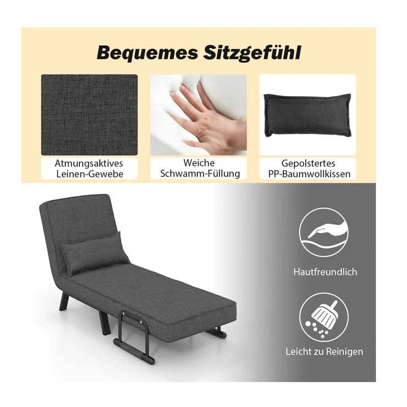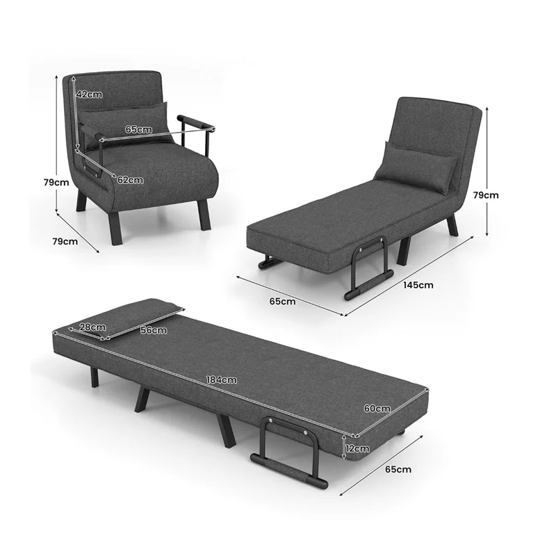Η πολυθρόνα – κρεβάτι, από την εταιρία Costway, είναι η ιδανική επιλογή για εσάς ή την οικογένειά σας. Μπορεί να χρησιμοποιηθεί ως κρεβάτι, πολυθρόνα και ξαπλώστρα, καλύπτοντας όλες τις ανάγκες σας. Το κάθισμα είναι κατασκευασμένο από υψηλής ποιότητας λινό ύφασμα και ελαστικό σφουγγάρι για μια άνετη εμπειρία καθίσματος. Μπορείτε επίσης να ακουμπήσετε τα χέρια σας στα μπράτσα για να χαλαρώσετε.