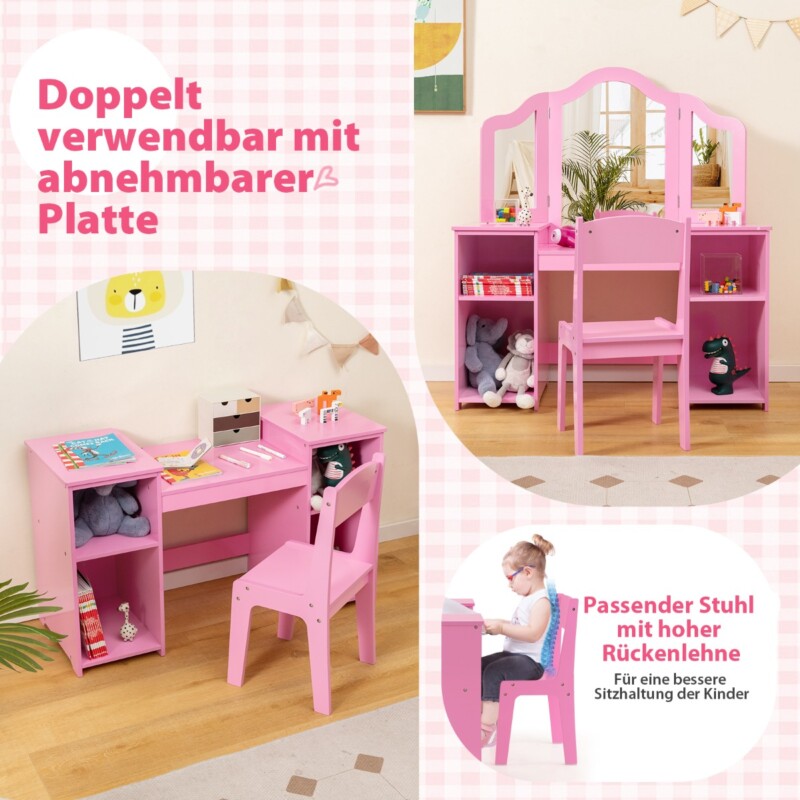 Costway Παιδικό Τραπέζι Ομορφιάς & Γραφείο με Αποσπώμενο Καθρέφτη & Ανοιχτά Ράφια Ροζ HY10142PI