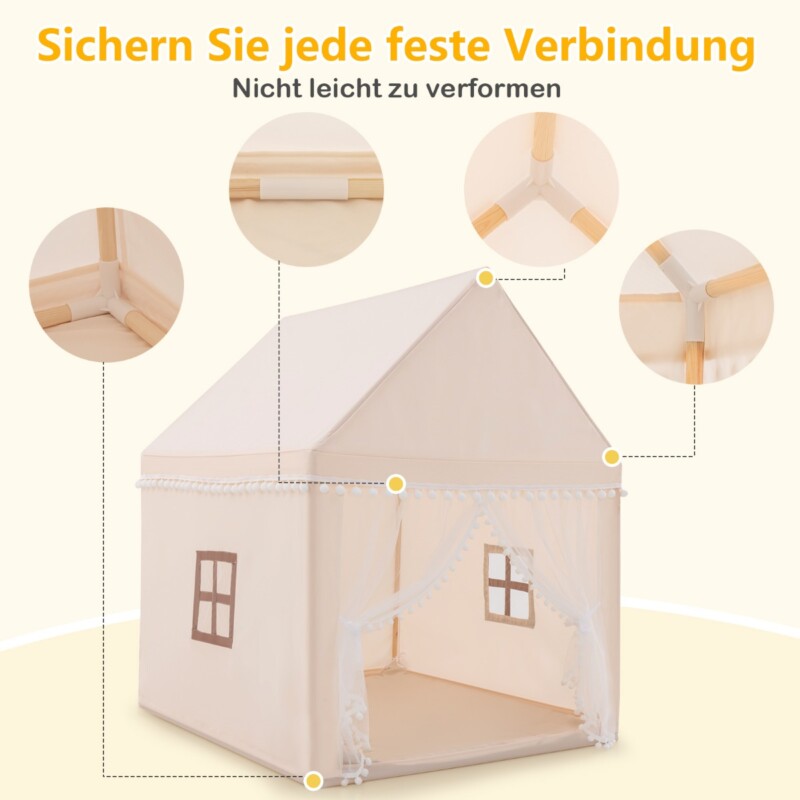 Στα παιδιά σας θα αρέσει σίγουρα αυτό το σπιτάκι! Όπως ένα πραγματικό σπίτι, αυτό το παιχνίδι είναι πολύ σταθερό με το πλαίσιο από μασίφ ξύλο. Περιλαμβάνεται μια μαλακή και παχιά κουβέρτα για να δημιουργήσει μια εξαιρετικά άνετη αίσθηση καθίσματος. Ολόκληρο το σπίτι είναι καλυμμένο με μη τοξικό και άοσμο ύφασμα Oxford, και μπορείτε να είστε σίγουροι ότι το παιδί σας θα βρίσκεται πάντα σε ένα ασφαλές περιβάλλον. Οι γοητευτικές πόρτες και τα παράθυρα δεν είναι μόνο διακοσμητικά, αλλά και για την κυκλοφορία του αέρα. Αγοράστε το σπίτι ως το τέλειο δώρο για το παιδί σας!