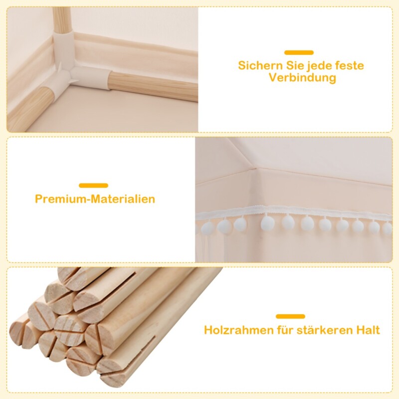 - Σταθερό & συμπαγές ξύλινο πλαίσιο: Χρησιμοποιώντας ξύλο πεύκου ως πλαίσιο, το προϊόν μας είναι εξαιρετικά σταθερό, όπως ένα πραγματικό σπίτι. Σε αντίθεση με μια παραδοσιακή λεπτή σκηνή, αυτό το σπιτάκι παιχνιδιού έχει ισχυρότερη υποστήριξη για τη διατήρηση του σχήματος, εξασφαλίζοντας ασφαλές παιχνίδι για τα παιδιά.
