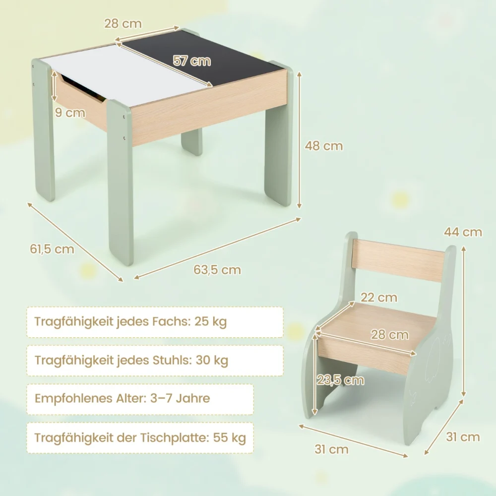 Costway Παιδικό σετ επίπλων 4 σε 1 από ξύλο με αφαιρούμενο πίνακα & αποθηκευτικό χώρο Πράσινο 60 x 60 x 48 εκ. HY10080LS