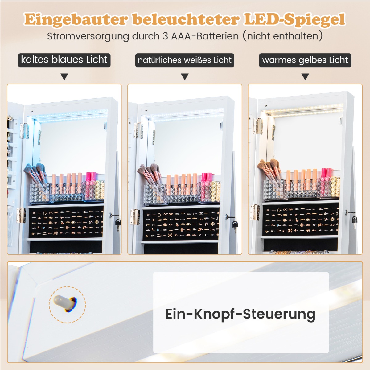 - Σχεδιασμός 3-σε-1: Συνδυάζει καθρέφτη πλήρους μήκους, ντουλάπα κοσμημάτων και ράφια αποθήκευσης για μέγιστη αποδοτικότητα χώρου.