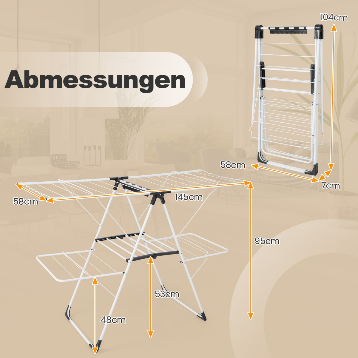 Αφήστε τα βρεγμένα ρούχα σας να στεγνώσουν πιο γρήγορα με την 2-επίπεδη απλώστρα μας! Η απλώστρα διαθέτει ρυθμιζόμενα φτερά με μέγιστη απόσταση 142 cm από το έδαφος, ώστε να μπορείτε να κρεμάσετε ρούχα διαφορετικού μήκους. Με 2-επίπεδο χώρο στεγνώματος, κυματιστή ράβδο και κλιπ για κάλτσες, υπάρχει αρκετός χώρος για διάφορα είδη ρούχων. Το πιο σημαντικό είναι ότι η απόσταση των 8,5 cm εξασφαλίζει καλή αερισμό και γρήγορο στέγνωμα. Η πτυσσόμενη απλώστρα είναι κατασκευασμένη από ανθεκτικούς και στιβαρούς μεταλλικούς σωλήνες και είναι σχεδιασμένη για μακροχρόνια χρήση. Οι χρυσές τριγωνικές δομές και οι σταθερές συνδέσεις εξασφαλίζουν γενική σταθερότητα. Τέλος, μπορείτε εύκολα να διπλώσετε ή να ξεδιπλώσετε αυτήν την ελεύθερη απλώστρα ανάλογα με τις ανάγκες σας.