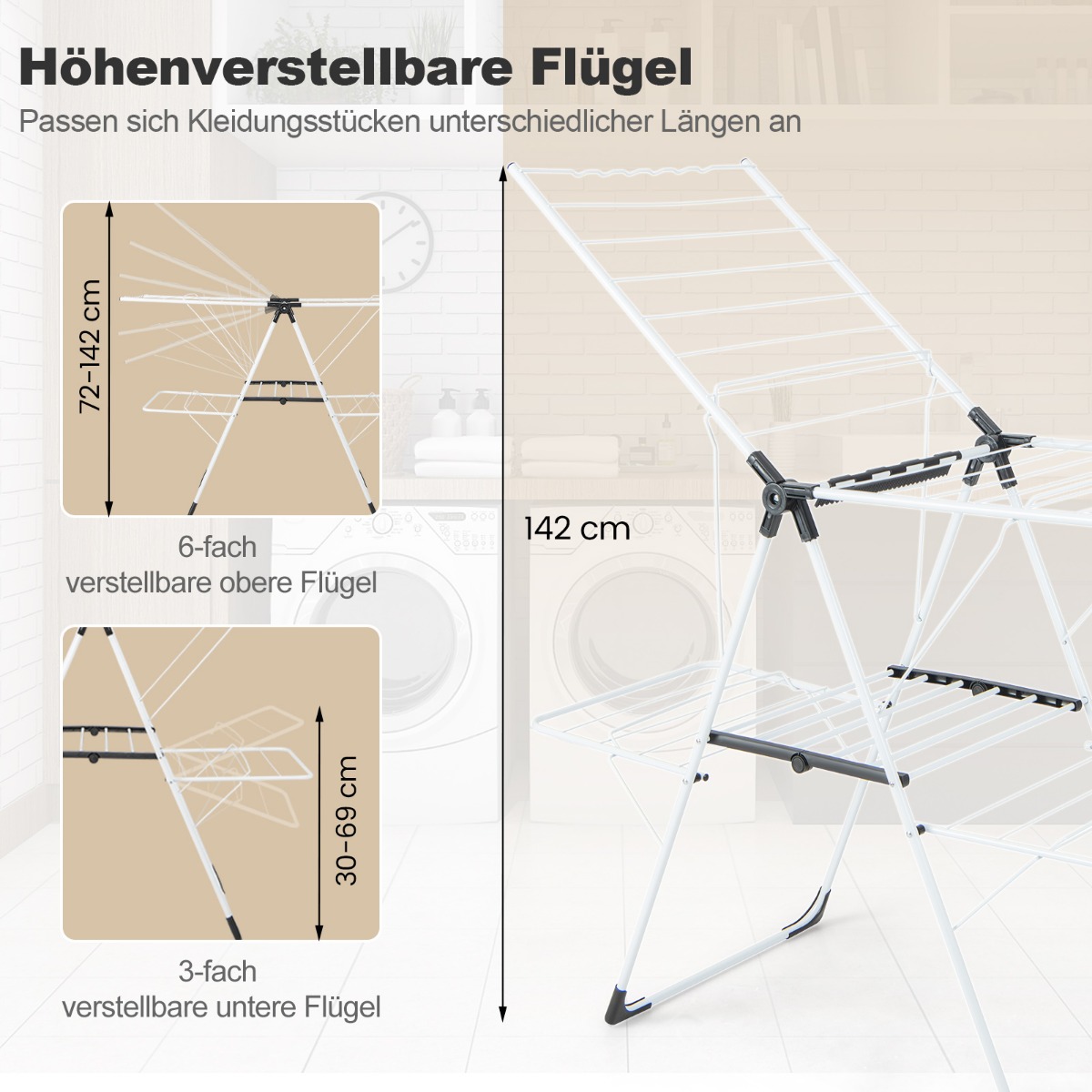 • Ρυθμιζόμενα φτερά: Αυτή η απλώστρα με 2 επίπεδα διαθέτει 6-φορές ρυθμιζόμενα άνω φτερά (72-142 cm) και 3-φορές ρυθμιζόμενα κάτω φτερά (30-69 cm). Η υψηλή απόσταση των 142 cm από το έδαφος επιτρέπει το κρέμασμα ακόμη και μακρύτερων ρούχων χωρίς δυσκολία.