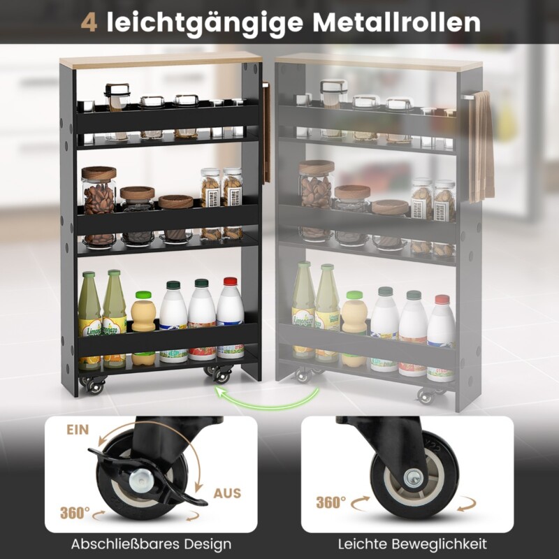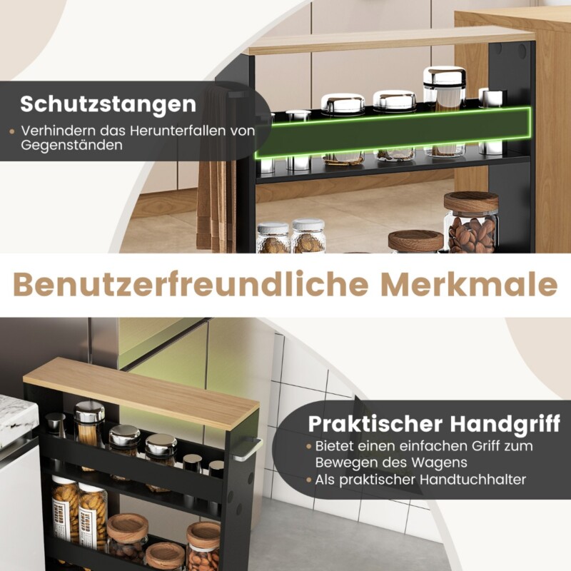 • Χαρακτηριστικά: Επεκτάσιμο, λεπτό καρότσι αποθήκευσης: Ψάχνετε για εξοικονόμηση χώρου; Με διαστάσεις 47,5 x 13 x 80,5 cm (Μ x Π x Υ), αυτό το λεπτό καρότσι κουζίνας ταιριάζει εύκολα σε στενά κενά, βελτιστοποιώντας έτσι τις δυνατότητες αποθήκευσης σε συμπαγείς περιοχές.