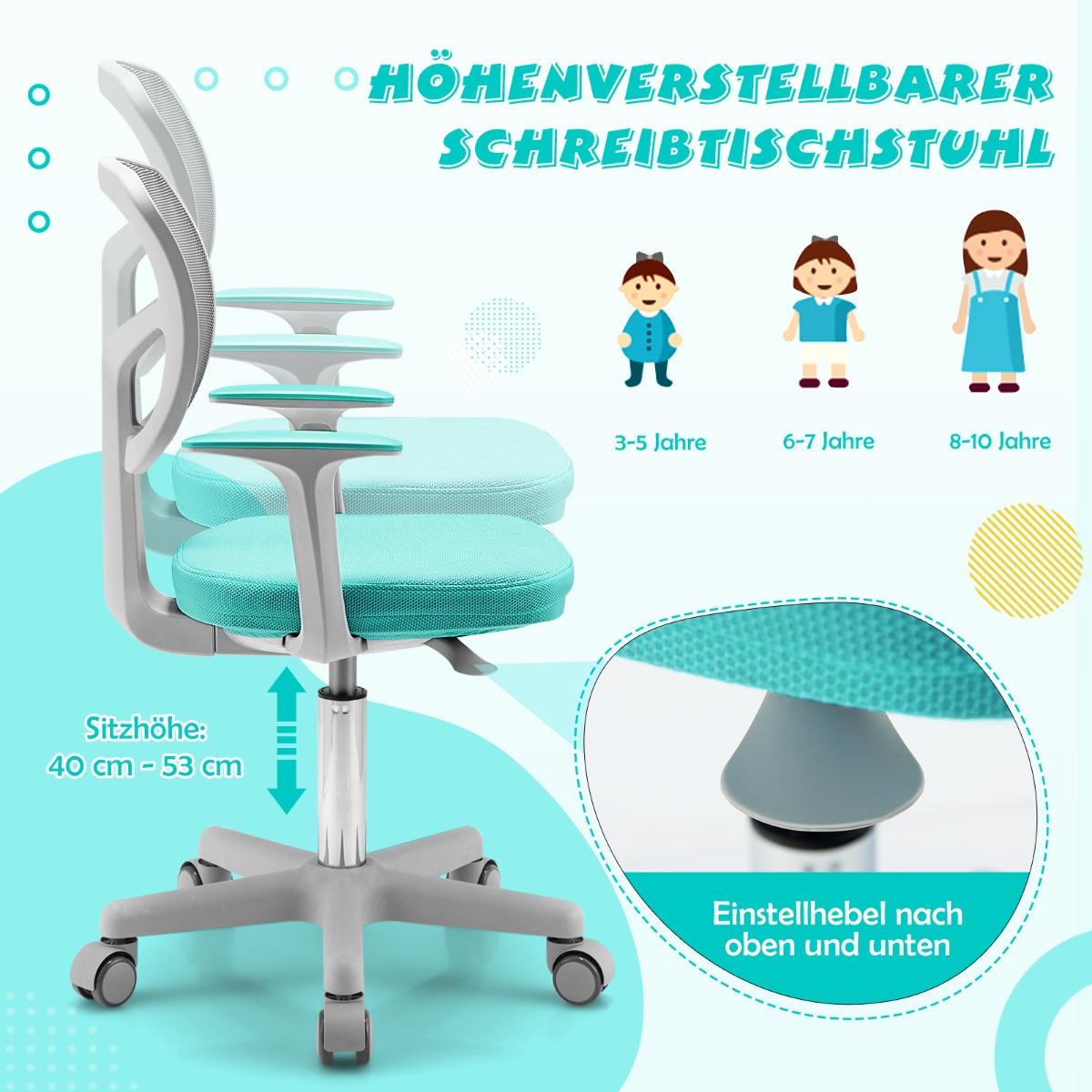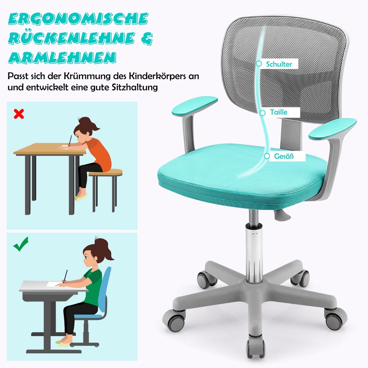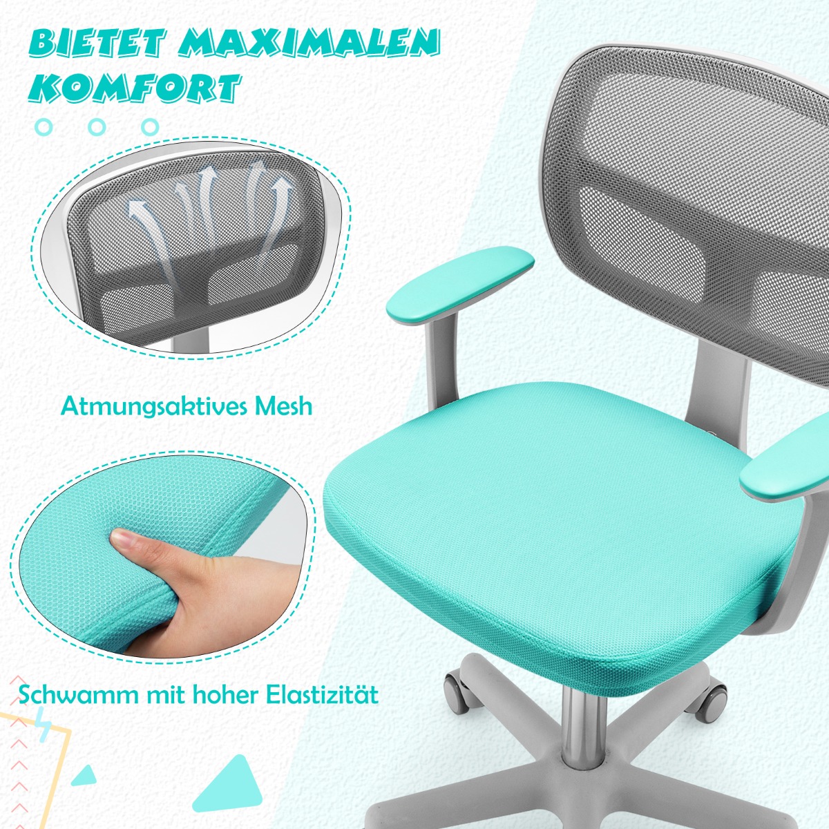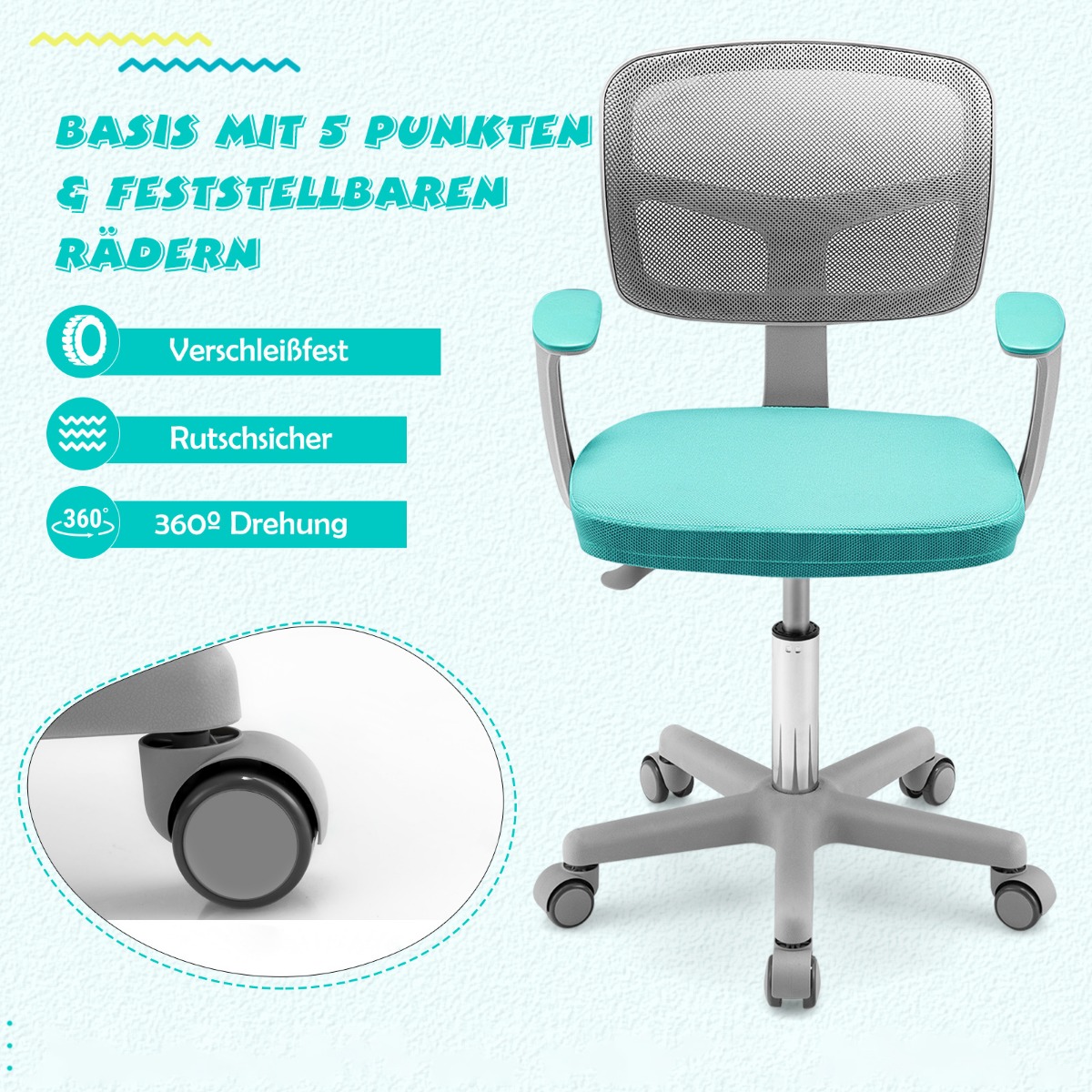 Χάρη στον υψηλής ποιότητας αεροκίνητο μοχλό, το ύψος ρυθμίζεται εύκολα πάνω και κάτω. Επιπλέον, το κάθισμα μπορεί να περιστραφεί 360° προς οποιαδήποτε κατεύθυνση. Η εργονομική πλάτη εξασφαλίζει υγιή στάση και υποστηρίζει την πλάτη άριστα. Η επένδυση του καθίσματος είναι αναπνεύσιμη, μαλακή και πολύ άνετη. Οι 5 τροχοί εγγυώνται εύκολη κίνηση. Η καρέκλα μπορεί να αντέξει 150 kg και είναι η τέλεια προσθήκη στο παιδικό δωμάτιο.