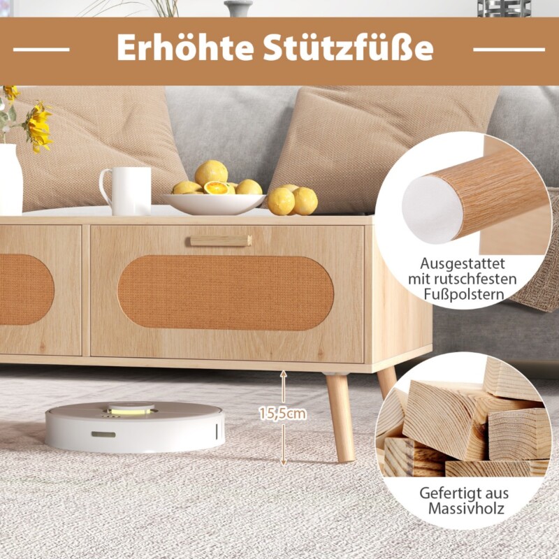 - Μποέμ γοητεία με συρτάρια από ρατάν: Το τραπεζάκι εντυπωσιάζει με μια συναρπαστική μποέμ αισθητική με χειροποίητες προσόψεις συρταριών από ρατάν, κατασκευασμένες από ανθεκτικό ξύλινο ύφασμα. Οι κομψές ξύλινες λαβές προσθέτουν έναν ρουστίκ γοητεία.