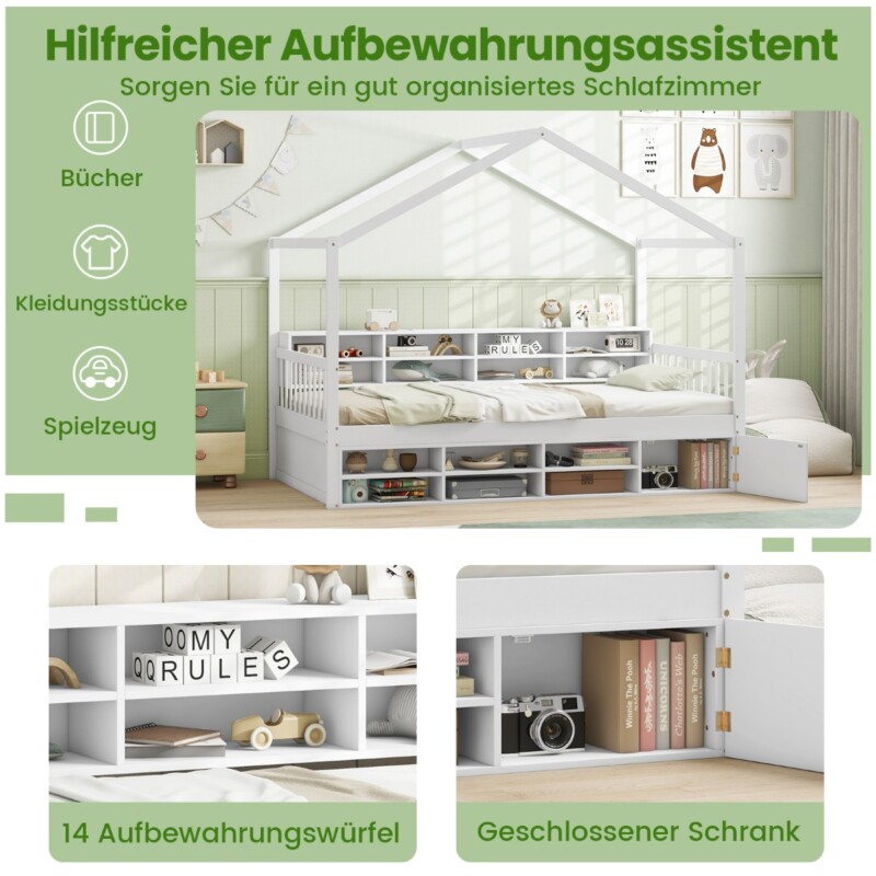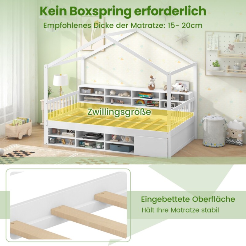 Costway Παιδικό κρεβάτι σπιτάκι 200 x 90 cm με προστατευτικό πτώσης & 14άρι τελάρο, Λευκό HU10940WH-T+