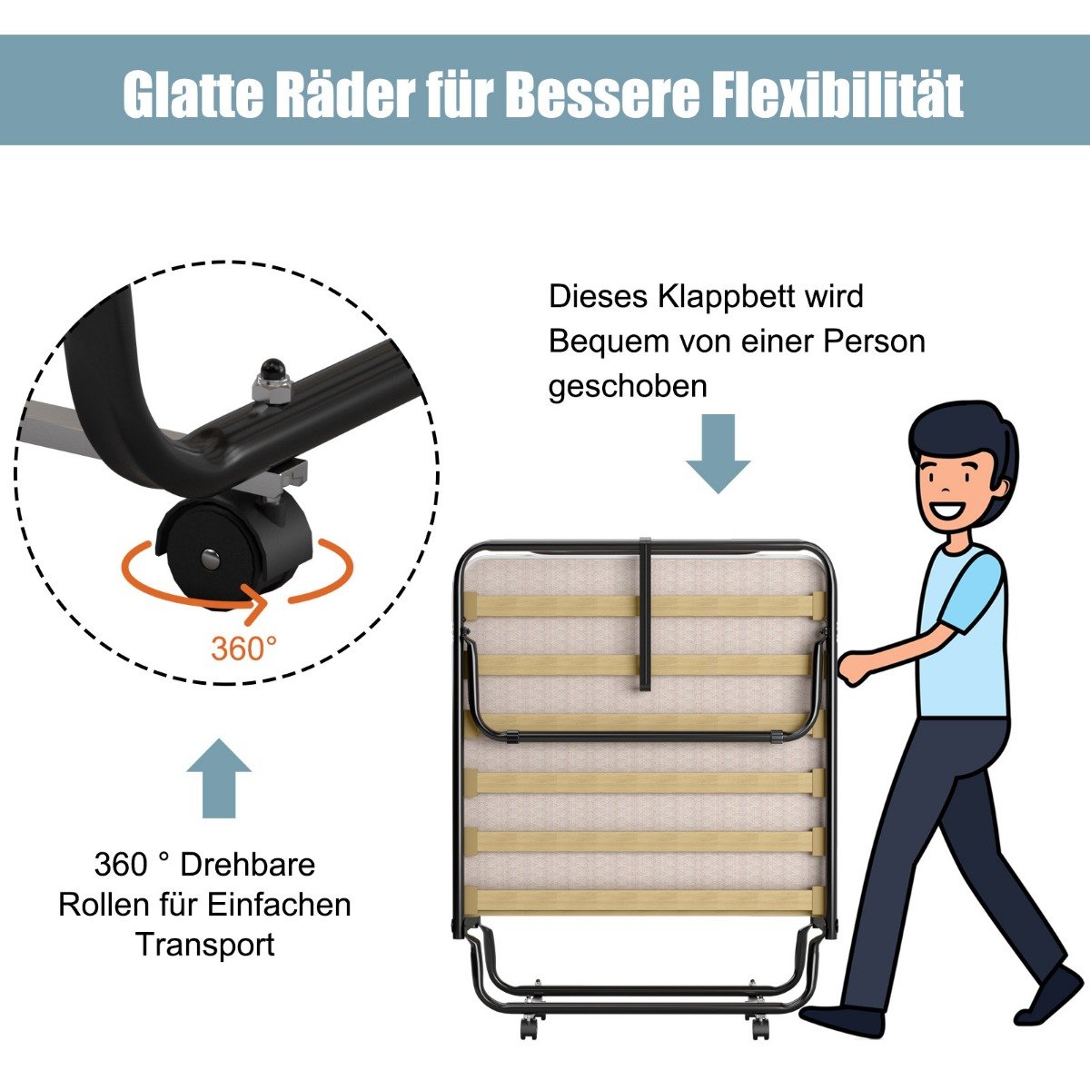 • Εύκολη μετακίνηση και πολυχρηστικότητα: 4 περιστρεφόμενοι τροχοί 360° σας επιτρέπουν να μετακινείτε εύκολα το πτυσσόμενο κρεβάτι σε οποιαδήποτε επιθυμητή θέση. Αυτό το κρεβάτι επισκεπτών με το άνετο στρώμα αφρού μνήμης είναι η τέλεια επιλογή για να φιλοξενήσετε τους καλεσμένους ή τους φίλους σας, να κάνετε έναν υπνάκο το μεσημέρι ή να χαλαρώσετε στο επόμενο ταξίδι σας.