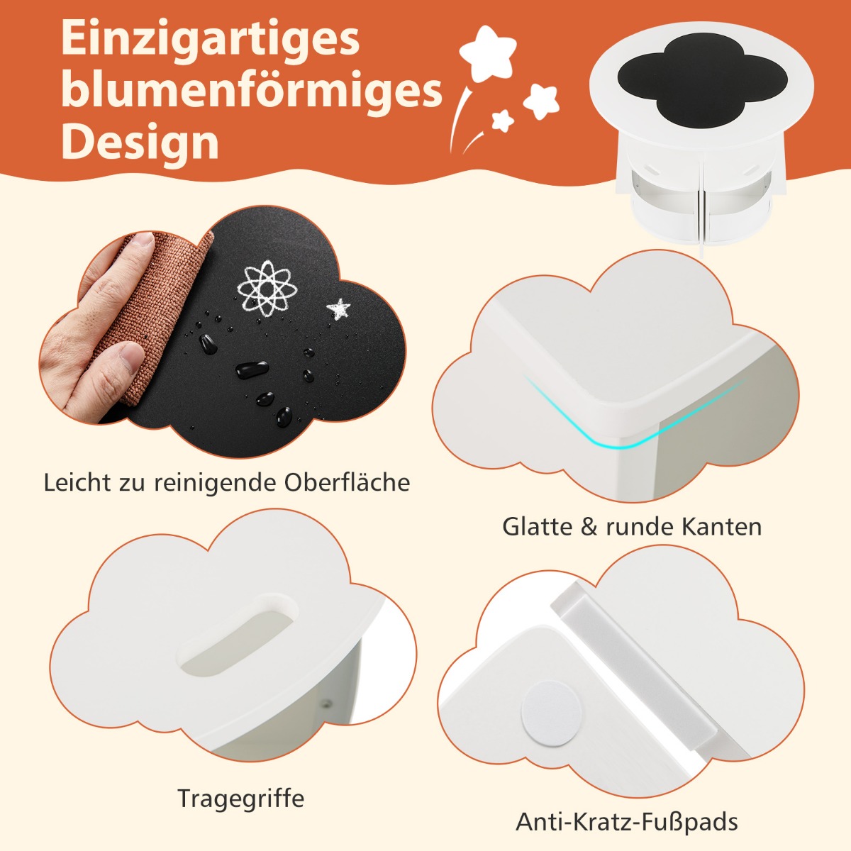 Χρησιμοποιήστε τον χώρο με τον καλύτερο τρόπο και ενισχύστε το δημιουργικό παιχνίδι με αυτό το καινοτόμο σετ παιδικού τραπεζιού και καρεκλών. Το σετ με τον εξοικονομητικό σχεδιασμό επιτρέπει την τακτοποίηση των 4 σκαμπό κάτω από το τραπέζι. Ιδανικό για διάφορες δραστηριότητες, περιλαμβάνει ενσωματωμένα κουτιά αποθήκευσης κάτω από κάθε σκαμπό για εύκολη πρόσβαση σε παιχνίδια, βιβλία και άλλα. Με γνώμονα την ασφάλεια, το σετ διαθέτει στρογγυλεμένες άκρες. Με αδιάβροχη επιφάνεια για εύκολο καθάρισμα, ενσωματωμένες λαβές για φορητότητα και κομψό σχεδιασμό σε σχήμα λουλουδιού, αυτό το ευέλικτο σετ προσθέτει λειτουργικότητα και γοητεία σε κάθε σύγχρονο σπίτι.
