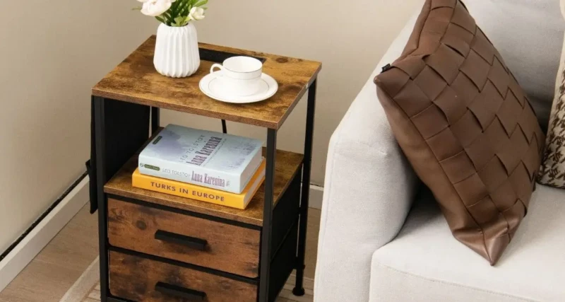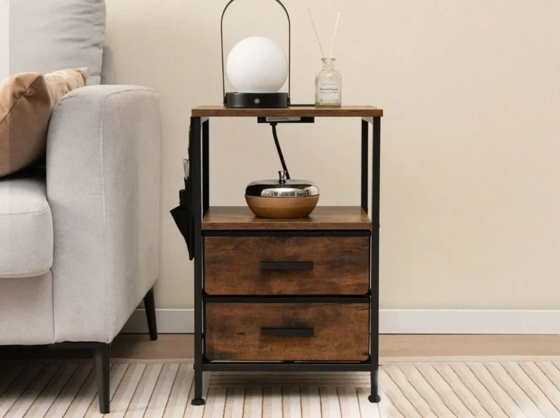 Costway Κομοδίνο με Σταθμό Φόρτισης & 2 Συρτάρια & 6 Πλαϊνές Τσέπες Βιομηχανικό Πλαϊνό Τραπέζι Καφέ JZ10362DE-1CF