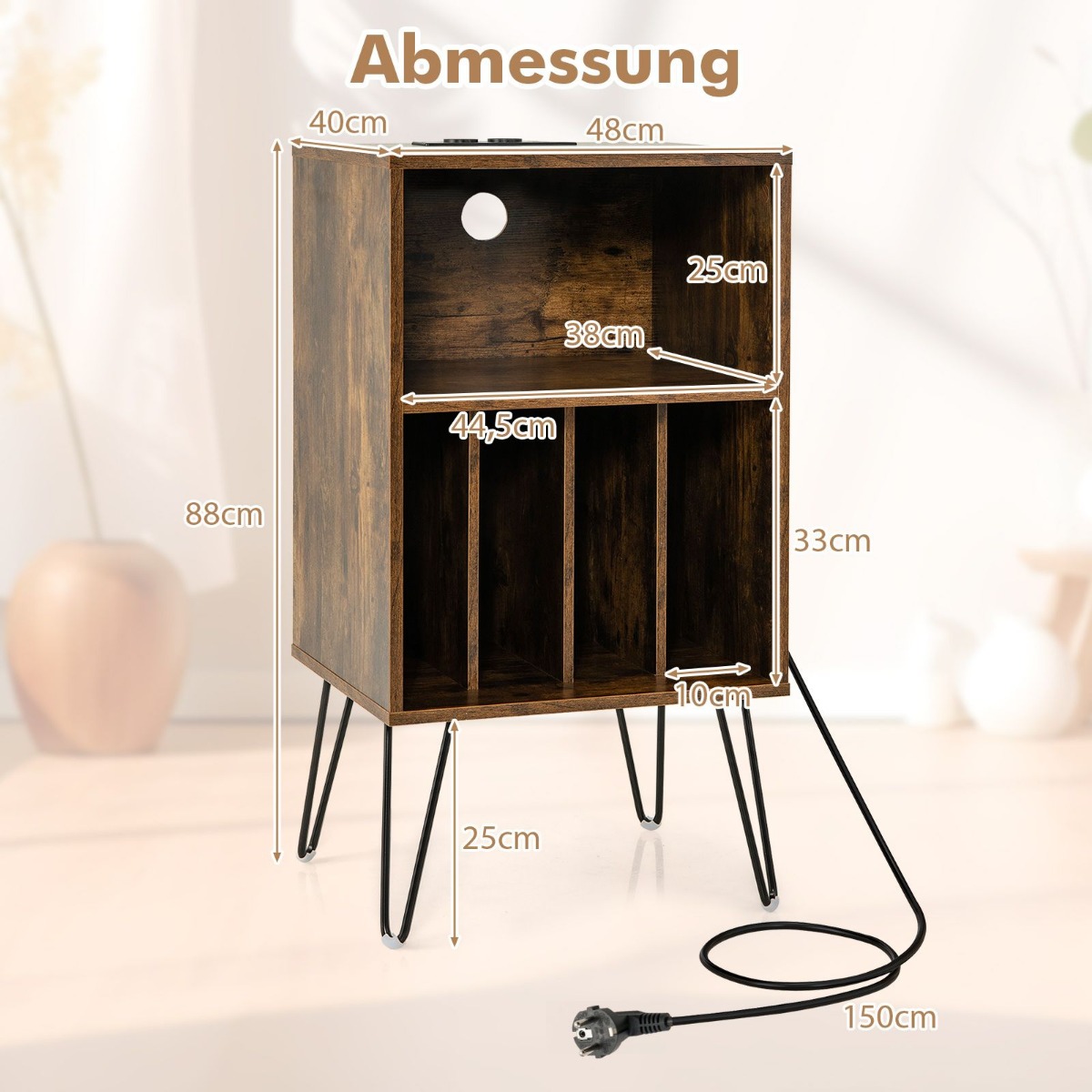 Αναβαθμίστε τον χώρο ακρόασης με αυτή την πρακτική και κομψή βάση πικάπ σε ρουστίκ καφέ απόχρωση. Σχεδιασμένη για λάτρεις του βινυλίου, του Hi-Fi και της μοντέρνας διακόσμησης, προσφέρει ειδική επιφάνεια για το πικάπ, ανοιχτό ράφι για αξεσουάρ και 4 διαχωριστικά αποθήκευσης για δίσκους, άλμπουμ ή CD. Παράλληλα, ο ενσωματωμένος σταθμός φόρτισης και η οπή διαχείρισης καλωδίων κάνουν τη χρήση ακόμα πιο άνετη και οργανωμένη.
