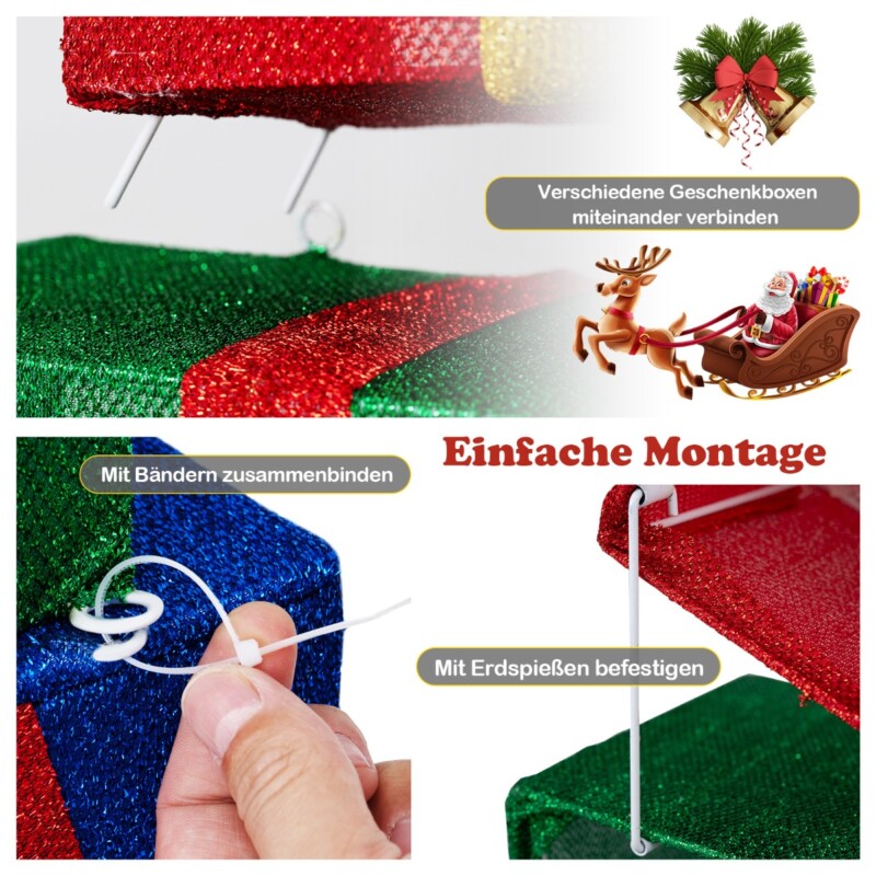 Δυνατότητες Τοποθέτησης: Τα κουτιά μπορούν να τοποθετηθούν το ένα πάνω στο άλλο ή ξεχωριστά, πράγμα που τα καθιστά ιδανικά για να διακοσμήσετε δίπλα στο χριστουγεννιάτικο δέντρο, στην βεράντα ή στον κήπο σας, δημιουργώντας γρήγορα μια φιλόξενη ατμόσφαιρα στο σπίτι σας.