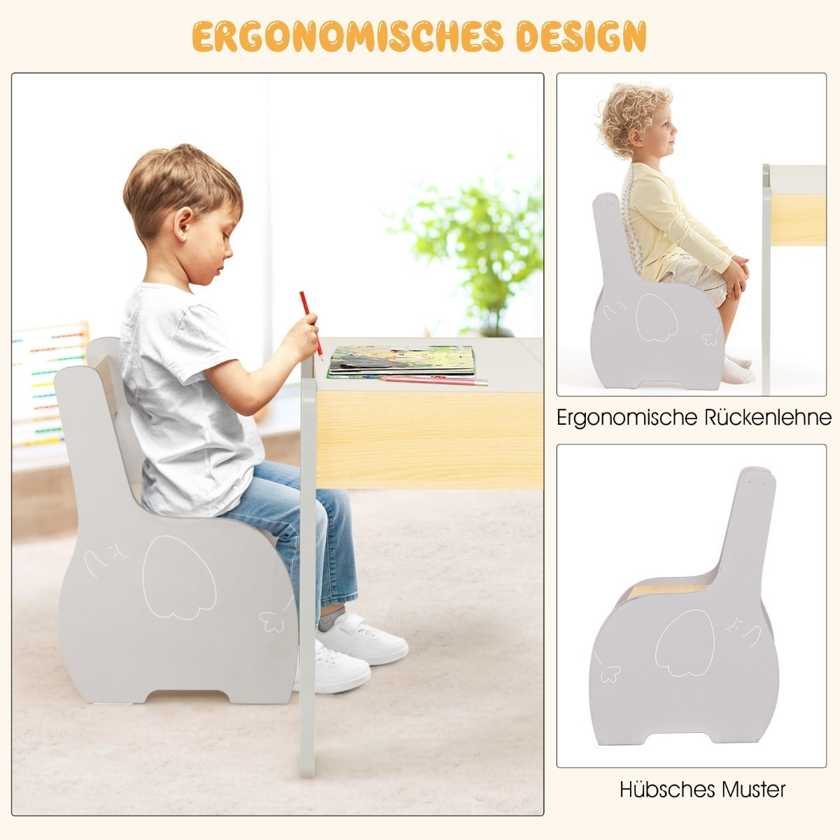 Το σετ τραπεζιού και καρεκλών 4-σε-1 είναι το ιδανικό έπιπλο για μάθηση και παιχνίδι για παιδιά ηλικίας 3-6 ετών! Με 2 αναστρέψιμες και αφαιρούμενες επιφάνειες, αυτό το τραπέζι δραστηριοτήτων μπορεί να μετατραπεί σε τραπέζι παιχνιδιών, γραφείο, σταθμό ζωγραφικής και ακόμη και τραπέζι φαγητού. Ο μεγάλος κρυφός αποθηκευτικός χώρος με προστασία από πτώσεις επιτρέπει στα παιδιά να αποθηκεύουν και να οργανώνουν παιχνίδια, αναπτύσσοντας έτσι μια καλή συνήθεια τακτοποίησης. Η εργονομική καρέκλα με την άνετη πλάτη βοηθά στην προστασία της σπονδυλικής στήλης των παιδιών και προάγει τη σωστή στάση καθίσματος. Αυτό το σετ τραπεζιού για παιδιά είναι κατασκευασμένο από ανθεκτική ξύλινη δομή και είναι ανθεκτικό, φιλικό προς τα παιδιά και σταθερό. Δύο καρέκλες βοηθούν το παιδί σας να διασκεδάσει, να μάθει και να παίξει με φίλους. Μετά το παιχνίδι, τα παιδιά μπορούν να τοποθετήσουν τις καρέκλες κάτω από το τραπέζι για εξοικονόμηση χώρου. Είτε για γενέθλια είτε για Χριστούγεννα, αυτό το σετ επίπλων σε παιδικό μέγεθος με όμορφο σχήμα ελέφαντα είναι πάντα η καλύτερη επιλογή για δώρο.