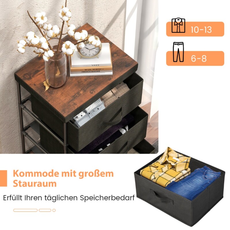 • Πτυσσόμενα Συρτάρια: Τα υφασμάτινα συρτάρια είναι αφαιρούμενα και εύκολα στη συναρμολόγηση, επιτρέποντας τη χρήση της συρταριέρας και ως ανοιχτό ράφι.