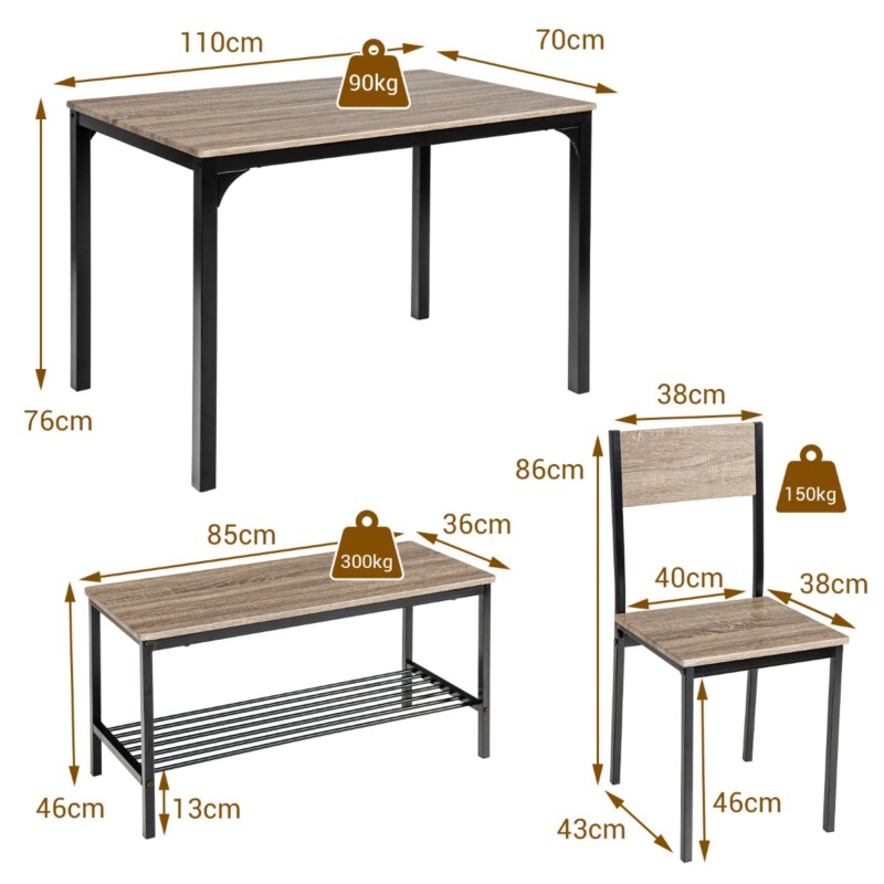 Το μοντέρνο σετ τραπεζαρίας μας είναι η ιδανική προσθήκη για το σπίτι σας και ιδανικό για συγκεντρώσεις με οικογένεια και φίλους. Αυτό το σετ περιλαμβάνει ένα ευρύχωρο τραπέζι, ένα μεγάλο παγκάκι και 2 εργονομικές καρέκλες, επιτρέποντας τη συνεύρεση 4 ατόμων. Κατασκευασμένο από ανθεκτικό MDF και σταθερό μεταλλικό πλαίσιο, εξασφαλίζει υψηλή σταθερότητα και μακροχρόνια χρήση. Ο βιομηχανικός του στυλ ταιριάζει με διάφορες εσωτερικές διακοσμήσεις. Επιπλέον, αυτό το μοντέρνο σετ μπορεί να χρησιμοποιηθεί ως γραφείο στο γραφείο και ως κομότα στο υπνοδωμάτιο, καλύπτοντας όλες τις ανάγκες σας. Επιπλέον, οι καρέκλες και το παγκάκι μπορούν να αποθηκευτούν κάτω από το τραπέζι, ιδανικό για περιορισμένο χώρο διαβίωσης. Συνοπτικά, αυτό το σετ τραπεζαρίας σας προσφέρει τόσο λειτουργικότητα όσο και ελκυστικότητα.