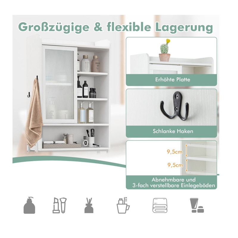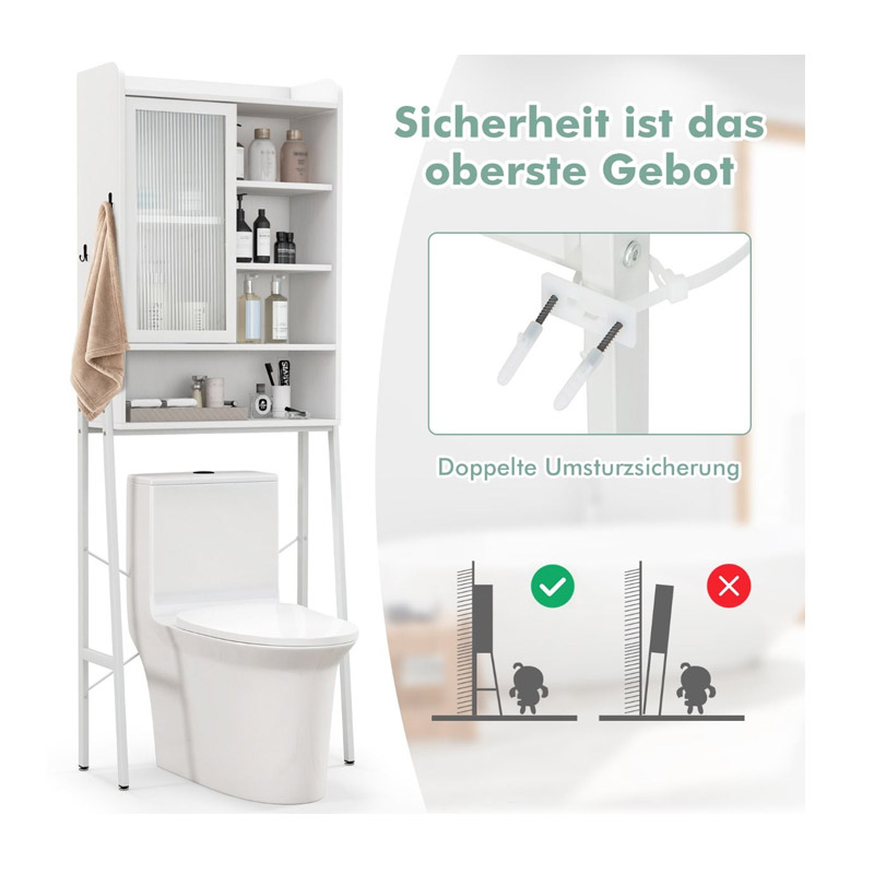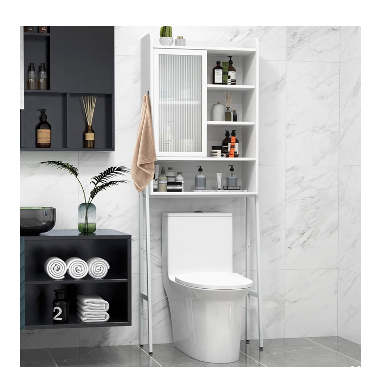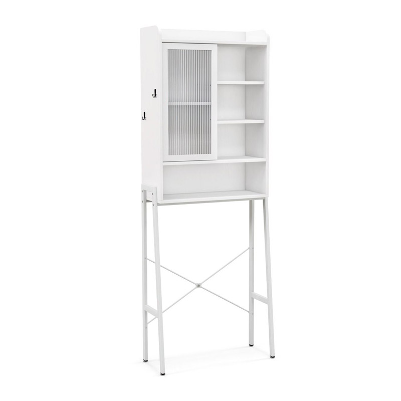 Το επάνω μέρος της εταζέρας, είναι κατασκευασμένο από επεξεργασμένο ξύλο. Προσφέρει 4 ανοιχτά ράφια και 1 ντουλάπι με συρόμενη πόρτα από ακρυλικό υλικό και 2 εσωτερικά ράφια. Τα ράφια ρυθμίζονται σε 3 ύψη για είδη διαφορετικού ύψους. Στην κορυφή, υπάρχει και 1 επιπρόσθετο ράφι για επιπλέον χώρο αποθήκευσης, ενώ στη μία πλευρά υπάρχουν 2 γάντζοι για πετσέτες.. Με διάκενο 60 x 86 cm, ταιριάζει στις περισσότερες λεκάνες τουαλέτας.