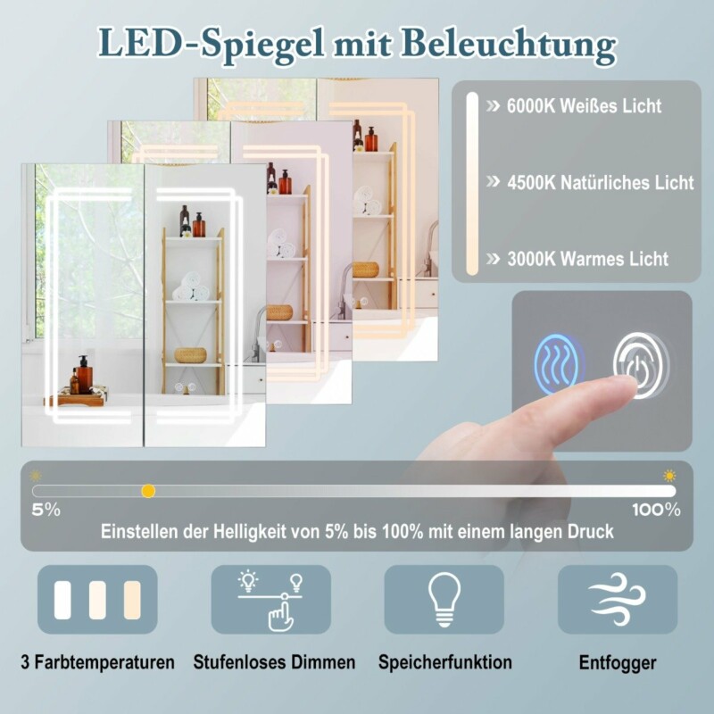 - Πολυλειτουργικές επιλογές φωτισμού: Το LED φωτιζόμενο ντουλάπι καθρέφτη προσφέρει ρυθμιζόμενες ρυθμίσεις χρώματος και φωτεινότητας. Αλλάξτε με ένα απλό άγγιγμα μεταξύ 3000K ζεστού φωτός, 4500K φυσικού φωτός ή 6000K λευκού φωτός και ρυθμίστε τη φωτεινότητα αδιάκοπα από 5% έως 100% με παρατεταμένη πίεση.