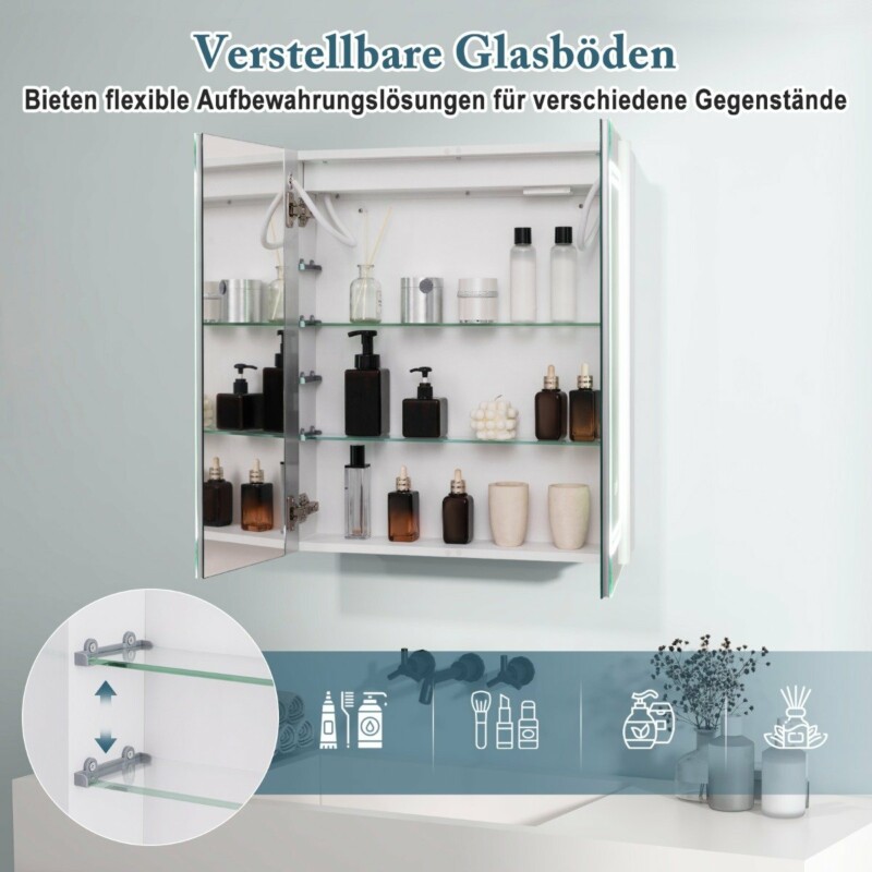 - Ρυθμιζόμενες λύσεις αποθήκευσης: Με 2 ρυθμιζόμενα γυάλινα ράφια, το ντουλάπι καθρέφτη τοίχου προσφέρει πολυλειτουργικές λύσεις αποθήκευσης για διάφορα μεγέθη αντικειμένων. Τα ράφια προσαρμόζονται εύκολα για να φιλοξενήσουν μεγάλα προϊόντα περιποίησης μαλλιών και μικρά αντικείμενα μακιγιάζ, προσφέροντας άφθονο χώρο για όλες τις ανάγκες σας.