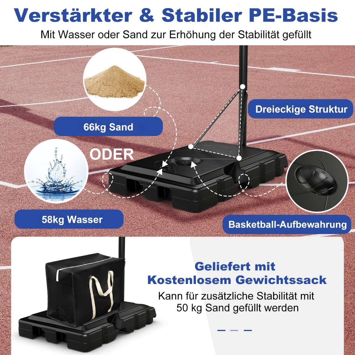 - Ενισχυμένη και σταθερή βάση PE: Η βάση του μπασκετόστατου μπορεί να γεμίσει με 55 l έως 58 l νερό ή 65 kg άμμο για να αυξήσει τη σταθερότητα. Η τριγωνική δομή ενισχύει περαιτέρω τη σταθερότητα. Επιπλέον, υπάρχει μια τσάντα ασφαλείας που μπορείτε να τοποθετήσετε στη βάση αφού τη γεμίσετε με άμμο.