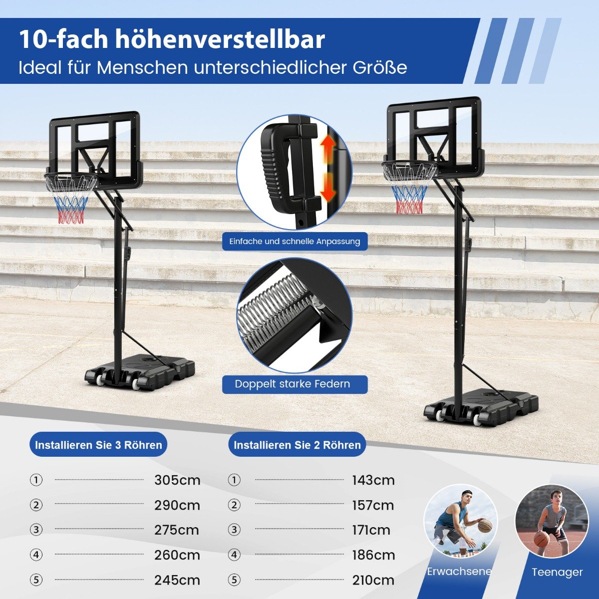- 5-επίπεδη ρυθμιζόμενη ύψος: Η απόσταση από το στεφάνι στο έδαφος είναι ρυθμιζόμενη σε 5 επίπεδα: 245/260/275/290 ή 305 cm, επιτρέποντας σε παίκτες διαφορετικών ηλικιών και ύψους να συμμετέχουν στο παιχνίδι. Επιπλέον, μπορείτε να ρυθμίσετε εύκολα το ύψος με τη λαβή και 2 ισχυρά ελατήρια.