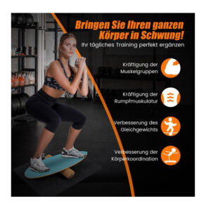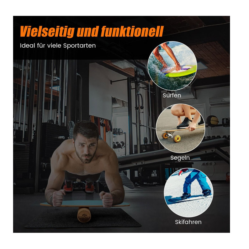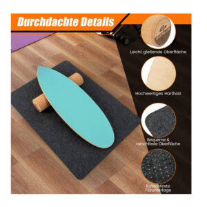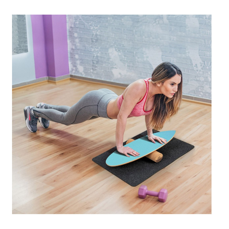 Η σανίδα ισορροπίας είναι κατασκευασμένη από πεπιεσμένο φυσικό ξύλο 8 στρώσεων με πάχος έως 13 mm και έχει χωρητικότητα βάρους έως 227 Kg. Η επιφάνεια και οι άκρες είναι ευχάριστα λείες και το πάνω μέρος της σανίδας είναι εξοπλισμένο με γυαλόχαρτο για καλύτερο κράτημα. Ο κύλινδρος από φελλό έχει επιφάνεια που γλιστρά εύκολα και παρέχει ομαλή κύλιση σε διάφορες εσωτερικές και εξωτερικές επιφάνειες. Το αντιολισθητικό χαλάκι από τσόχα αποτρέπει την κίνηση κατά τη διάρκεια της άσκησης και μειώνει το επίπεδο θορύβου.