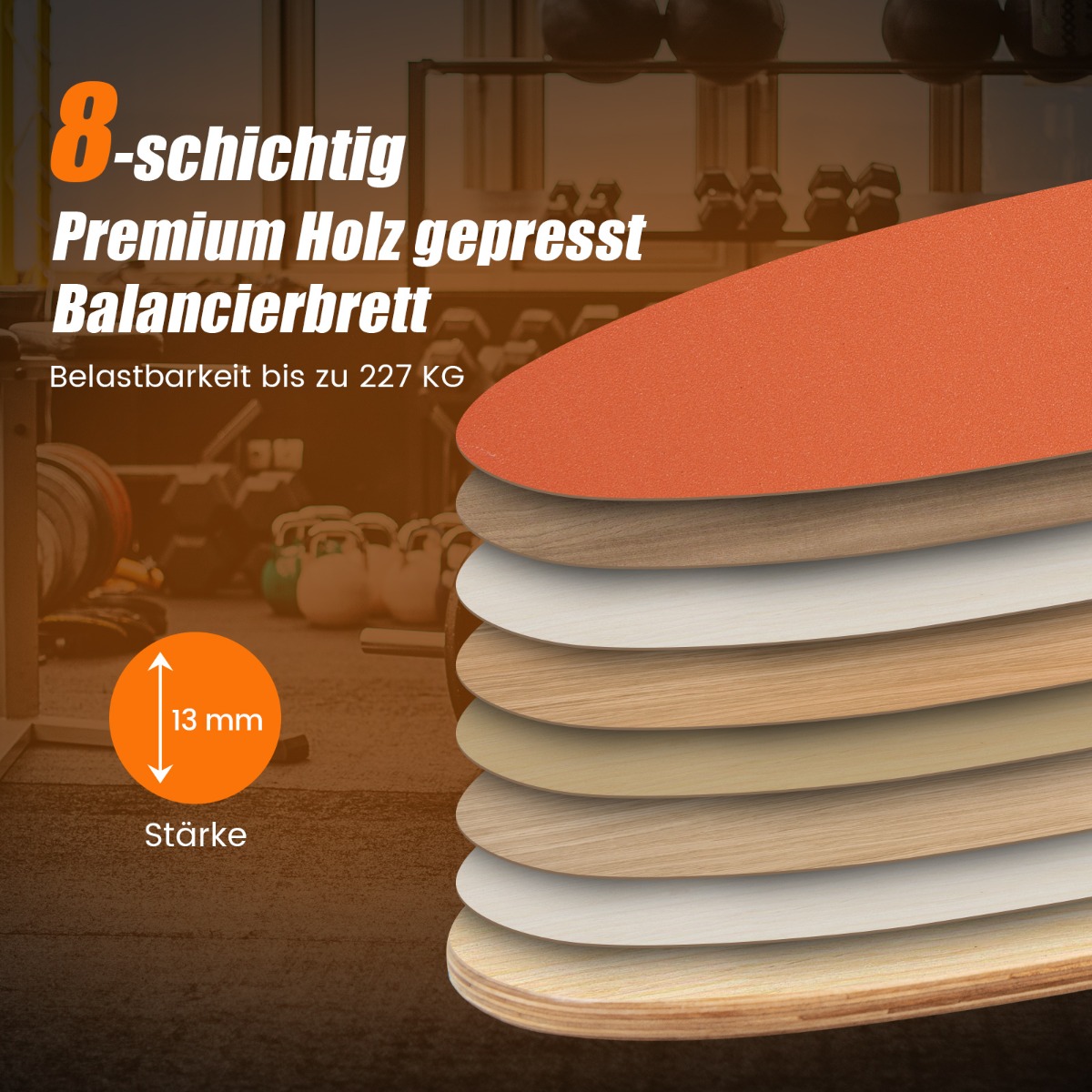 Η σανίδα ισορροπίας είναι κατασκευασμένη από 8 στρώσεις συμπιεσμένου φυσικού ξύλου και έχει χωρητικότητα βάρους έως 227 κιλά. Η επιφάνεια και οι άκρες είναι ευχάριστα λείες και η κορυφή της σανίδας είναι εξοπλισμένη με γυαλόχαρτο για καλύτερη πρόσφυση. Αυτή η σανίδα ισορροπίας συνοδεύεται επίσης από έναν κύλινδρο φελλού και ένα χαλάκι από τσόχα. Εκτός από τη βελτίωση της ικανότητας ισορροπίας, αυτός ο προπονητής ισορροπίας βοηθά επίσης στην ανάπτυξη μυών και στη συντονισμό του σώματος. Επιπλέον, είναι εύκολο στη μεταφορά λόγω του ελαφρού βάρους.
