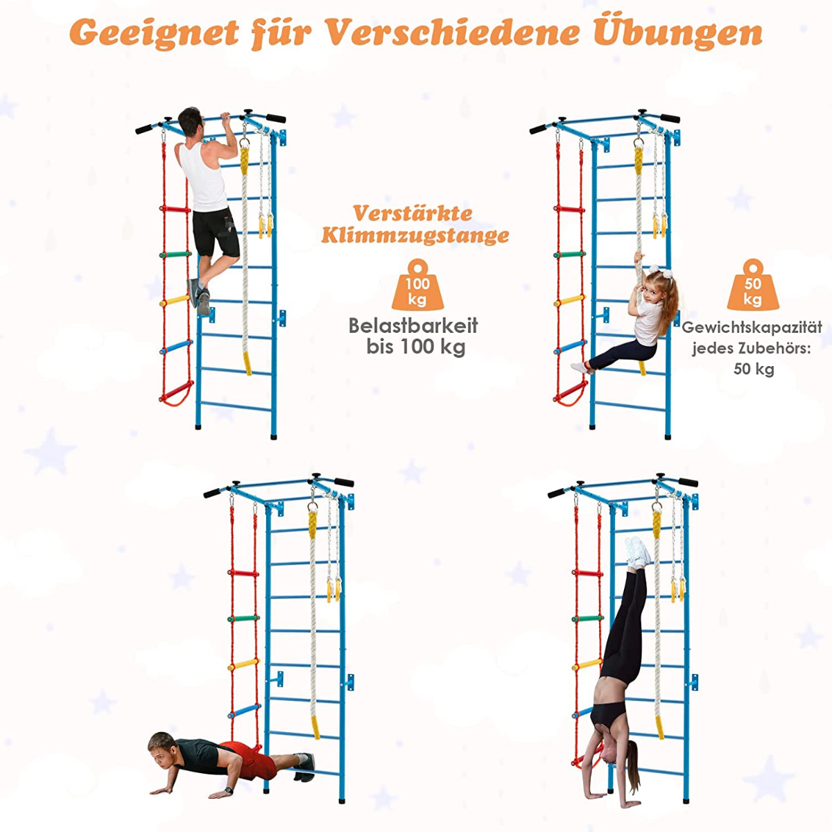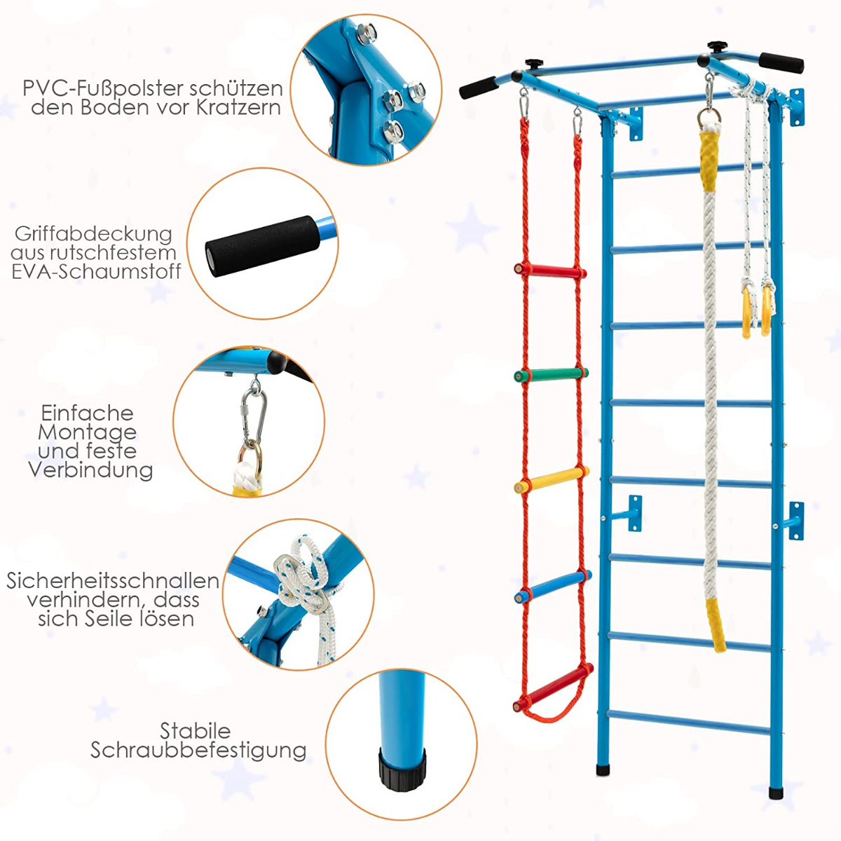 Εξοπλισμένο με σκάλα τοίχου, μονόζυγο, σκάλα σχοινιού, σχοινί και κρίκους γυμναστικής, τα παιδιά βρίσκουν τη δική τους διασκέδαση σε αυτό το εσωτερικό γυμναστήριο τοίχου. Ο σκελετός του σετ σκαλοπατιών είναι κατασκευασμένος από σωλήνες ανθρακούχου χάλυβα με επίστρωση πούδρας, ανθεκτικούς και ανθεκτικούς στη σκουριά για μακροχρόνια χρήση. Η επιφάνεια καθαρίζεται εύκολα με ένα υγρό πανί. Οι συνδέσεις και τα εξαρτήματα είναι από γαλβανισμένο ανθρακούχο χάλυβα για καλύτερη αντοχή στη σκουριά. Η συναρμολόγηση είναι εύκολη με τις οδηγίες. Και ολόκληρο το σετ γυμναστικής για παιδιά στερεώνεται σταθερά στον τοίχο με 8 διαστολικές βίδες που περιλαμβάνονται.