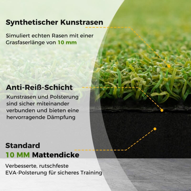 - Κατασκευή premium χαλιού: Το χαλάκι μας είναι κατασκευασμένο με πολυεπίπεδο σχεδιασμό και διαθέτει ρεαλιστικό γρασίδι για μια ρεαλιστική εμπειρία εξάσκησης στο γήπεδο γκολφ. Επιπλέον, η ανθεκτική επένδυση και το υψηλής ποιότητας στρώμα EVA εξασφαλίζουν μακροχρόνια απόδοση.