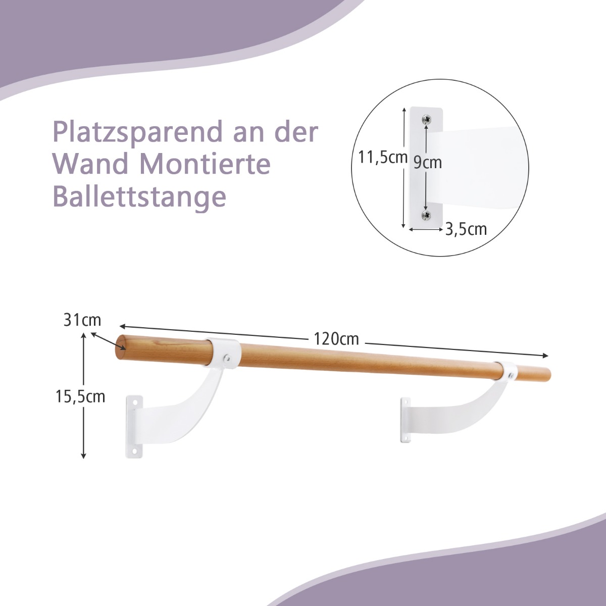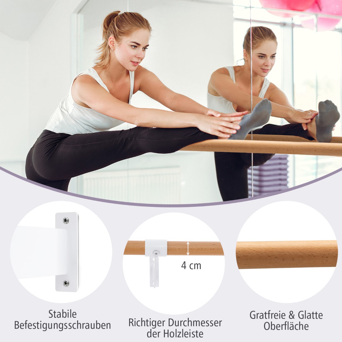 Το 100% φυσικό ξύλο οξιάς επιτρέπει σε αυτήν την μπάρα μπαλέτου τοίχου να σας συνοδεύει για πολλά χρόνια. Η επιφάνεια είναι λειασμένη για να προστατεύει το ευαίσθητο δέρμα σας. Επιπλέον, ο σχεδιασμός τοίχου εξοικονομεί πολύ χώρο. Με τη σταθερή υποστήριξη από μεταλλικές βάσεις και ενισχυμένες βιδωτές συνδέσεις, η μπάρα χορού από μασίφ ξύλο έχει ισχυρή αντοχή φορτίου 100 kg. Επιπλέον, αυτή η παραδοσιακή μονή μπάρα χορού σας επιτρέπει να κάνετε διάφορες ασκήσεις όπως γιόγκα, μπαλέτο, πιλάτες κ.λπ. και μπορεί να χρησιμοποιηθεί σε στούντιο ή σχολεία για επαγγελματική εκπαίδευση μπαλέτου.