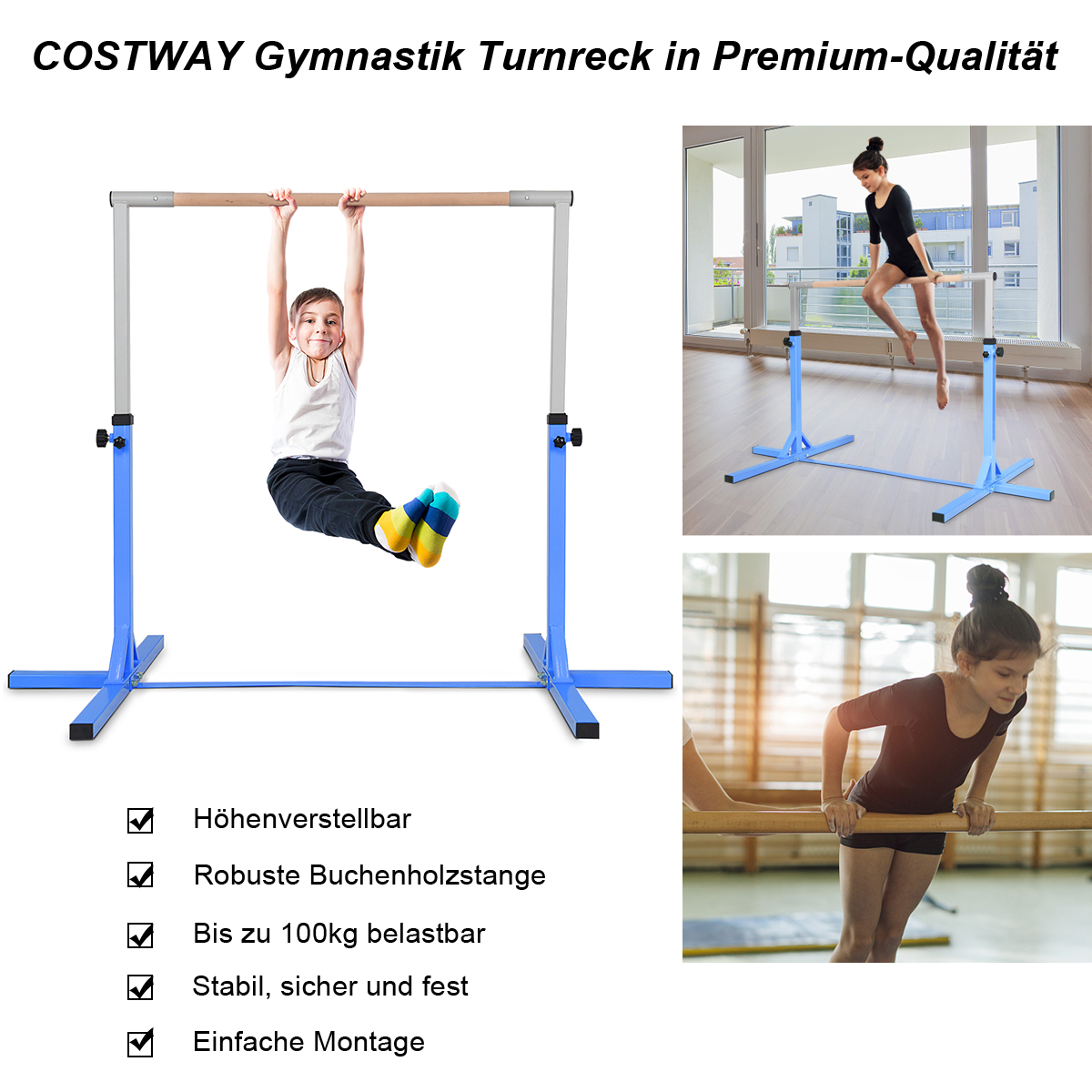 Η Junior Reckstange είναι ανθεκτική και ασφαλής κατασκευή. Κατασκευασμένη από υψηλής ποιότητας χάλυβα, ιδανική για προπόνηση στο σπίτι (Γυμναστικό επίπεδο 1 έως 4). Ειδικά σχεδιασμένα κουμπιά βιδών διευκολύνουν τη ρύθμιση του ύψους από 91 έως 150 cm σε διαστήματα 5 cm σε 12 επίπεδα. Είναι ιδανική για νεαρούς αθλητές, καθώς μπορεί να προσαρμοστεί στο μέγεθός τους κατά τη φάση ανάπτυξης. Ξεκινήστε την προπόνηση γυμναστικής του παιδιού σας με μια υψηλής ποιότητας γυμναστική μπάρα!