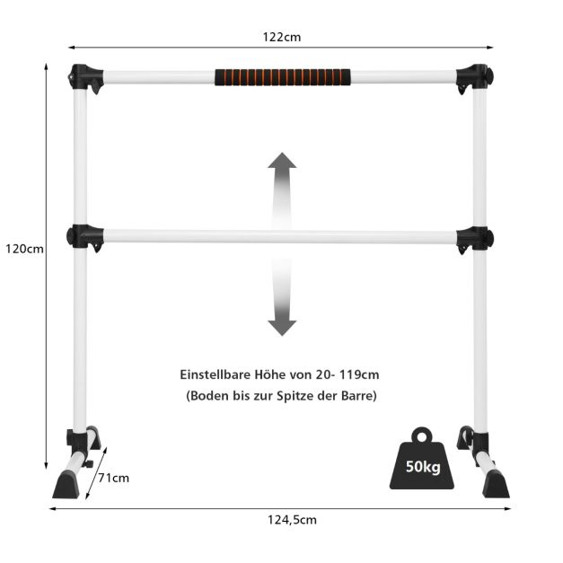 Η ρυθμιζόμενη μπάρα μπαλέτου είναι κατασκευασμένη από ανθεκτικό στη σκουριά μέταλλο με 4 αντιολισθητικά πόδια, που εγγυάται σταθερότητα κατά τη χρήση.