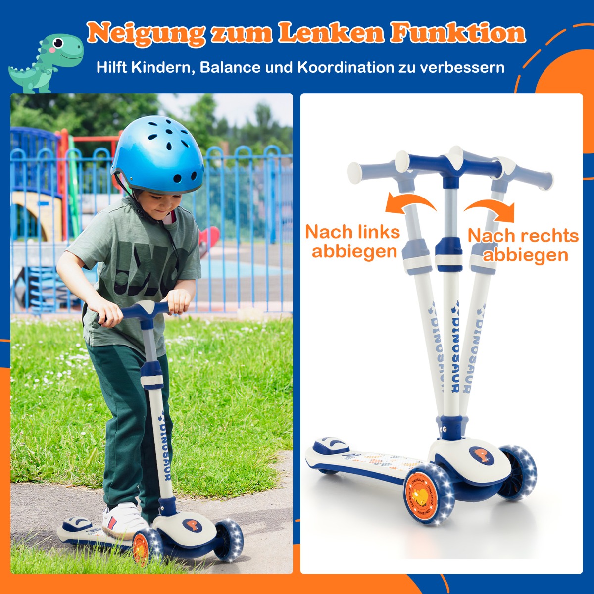 - Κατεύθυνση με κλίση: Το τρίτροχο πατίνι είναι εξοπλισμένο με την τεχνολογία Lean-to-Steer. Τα παιδιά μπορούν να καθορίσουν την κατεύθυνση κλίνοντας το σώμα τους, αντί να στρίβουν το τιμόνι, κάτι που είναι ευεργετικό για την ανάπτυξη της ισορροπίας, του συντονισμού και της αυτοπεποίθησης.
