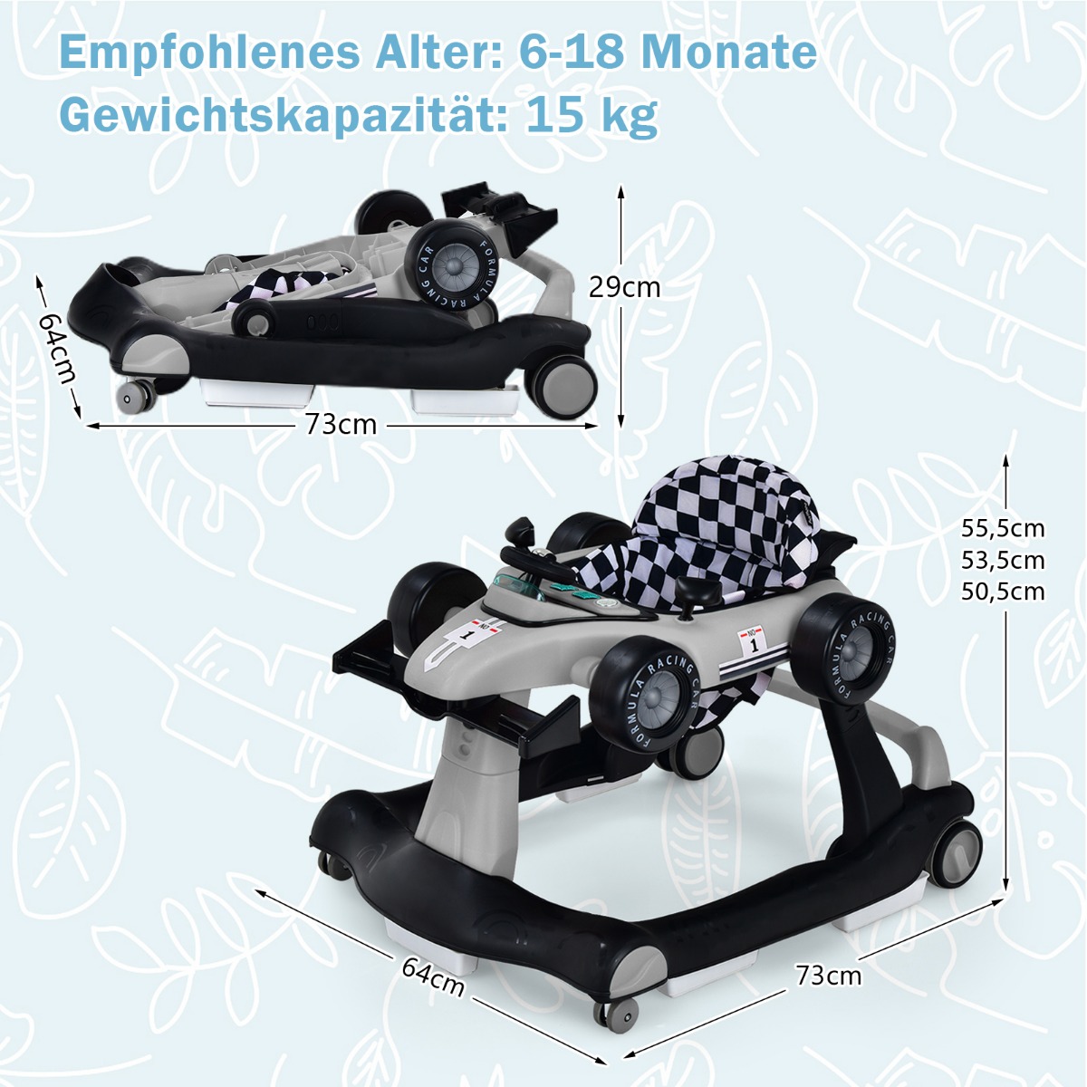 - Διαδραστικός Σχεδιασμός: Ο περιπατητής διαθέτει τιμόνι, ταχύτητες, 2 κουμπιά φωτός και 2 καθρέφτες, κάνοντάς τον να μοιάζει με μικρό αγωνιστικό αυτοκίνητο. Επίσης, μπορεί να αναπαράγει μουσική. Απαιτούνται 2 μπαταρίες AA (δεν περιλαμβάνονται).