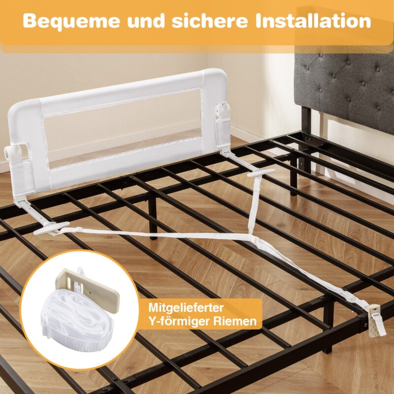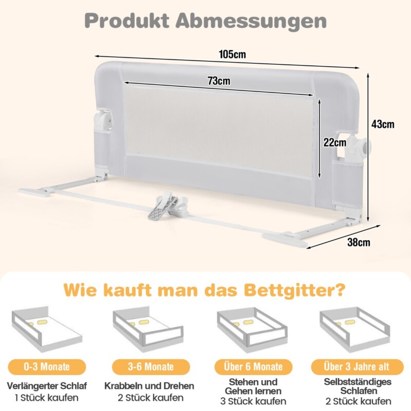 Με έναν παρεχόμενο ιμάντα, το κάγκελο μπορεί να στερεωθεί εύκολα στο κρεβάτι. Ο απρόσκοπτος σχεδιασμός και ο αφρός αντικραδασμικής προστασίας προσφέρουν εξαιρετική ασφάλεια. Το διαφανές δίχτυ σας επιτρέπει να παρακολουθείτε το μωρό σας ανά πάσα στιγμή. Το υψηλής ποιότητας ύφασμα Oxford προσφέρει μεγάλη διάρκεια ζωής. Η ράγα του κρεβατιού μπορεί να κατεβεί εύκολα. Όταν είναι κατεβασμένη, τα παιδιά μπορούν να μπουν στο κρεβάτι χωρίς δυσκολία. Το πακέτο περιλαμβάνει μία ράγα, αλλά μπορείτε να επιλέξετε περισσότερες για μεγαλύτερη ασφάλεια και ιδιωτικότητα. Είναι ιδανική επιλογή για κρεβάτια με μεταλλικό πλαίσιο, ξύλινα κρεβάτια, δερμάτινα κρεβάτια, κρεβάτια κουτιού και άλλους τύπους.