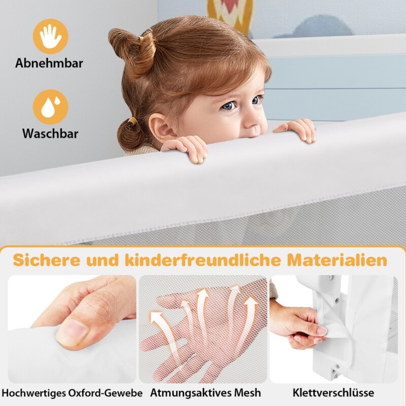 - Ασφαλή και φιλικά προς τα παιδιά υλικά: Το κάγκελο μήκους 105 cm είναι καλυμμένο με υψηλής ποιότητας ύφασμα Oxford και είναι φιλικό προς το δέρμα. Χάρη στους ιμάντες Velcro, μπορείτε να αφαιρέσετε το κάλυμμα γρήγορα και να το καθαρίσετε εύκολα. Το αναπνεύσιμο δίχτυ επιτρέπει στους γονείς να βλέπουν τα μωρά τους και επιτρέπει την άριστη κυκλοφορία του αέρα.