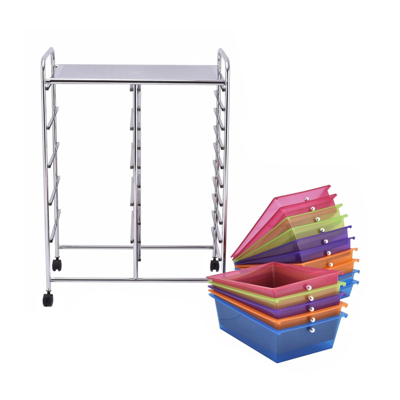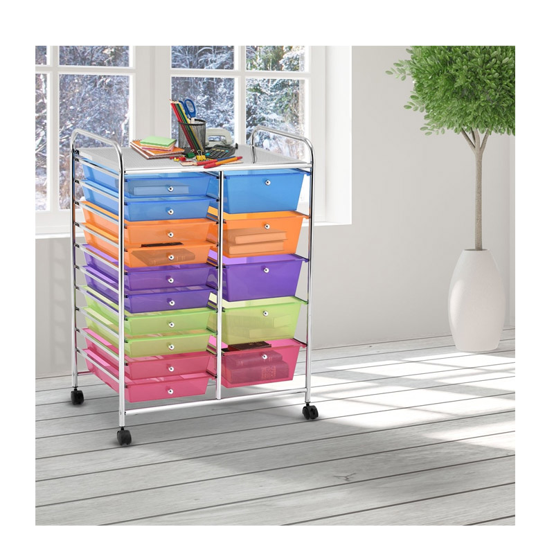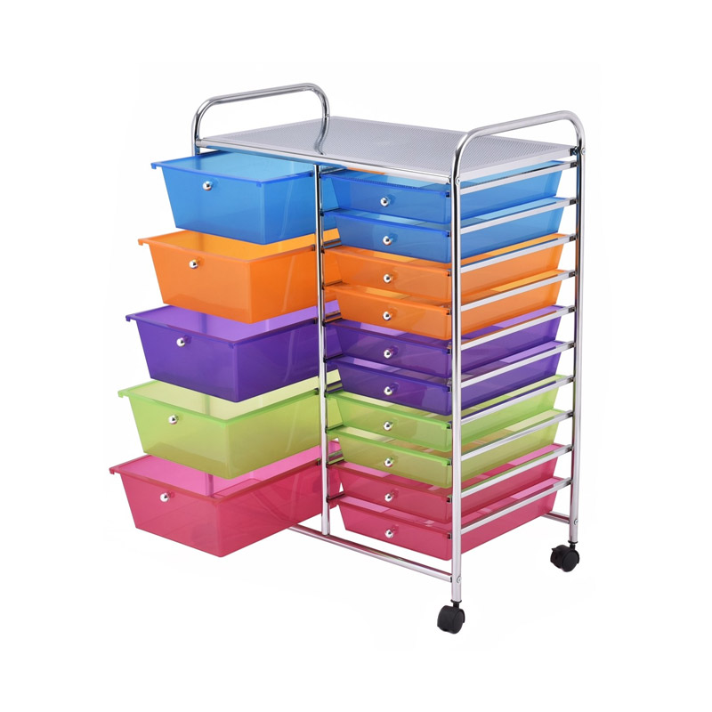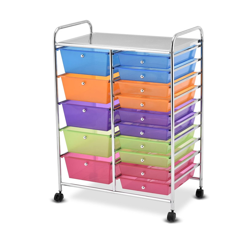Το πολυλειτουργικό τρόλεϊ, από την εταιρία Costway, διαθέτει πλαίσιο από ανθεκτικό μέταλλο για μέγιστη σταθερότητα, 1 μεταλλικό, διάτρητο ράφι στην κορυφή και 15 ευρύχωρα, πλαστικά συρτάρια για να σας προσφέρει άφθονο αποθηκευτικό χώρο. Είναι εξοπλισμένο με τέσσερις περιστρεφόμενους τροχούς για εύκολη κίνηση (οι δύο με φρένα) και είναι ιδανικό για την κουζίνα, το μπάνιο ακόμη και για το γραφείο.
