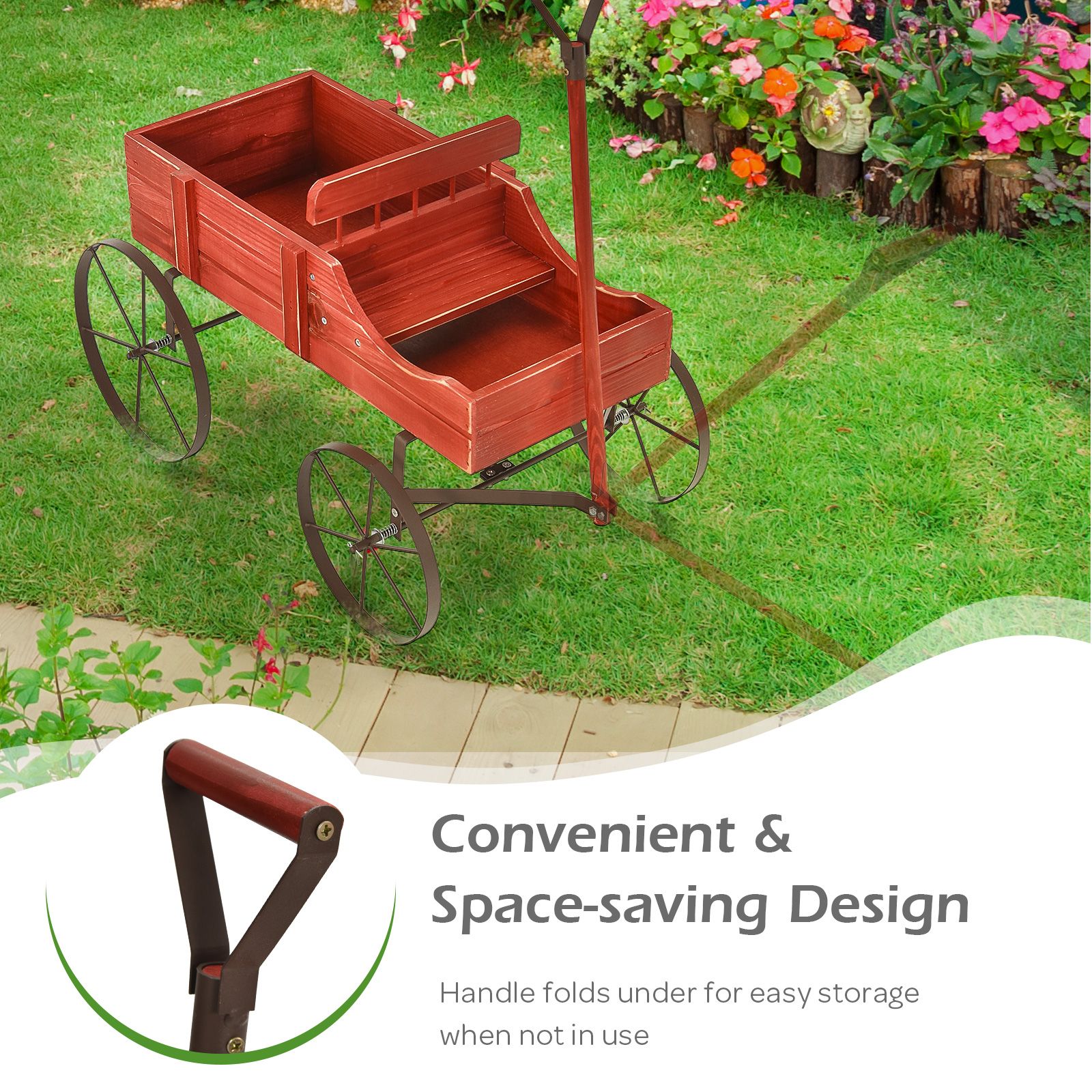 Οι ρόδες είναι λειτουργικές και επιτρέπουν τη μετακίνηση του καροτσιού σε διάφορα σημεία του κήπου ή της αυλής σας. -