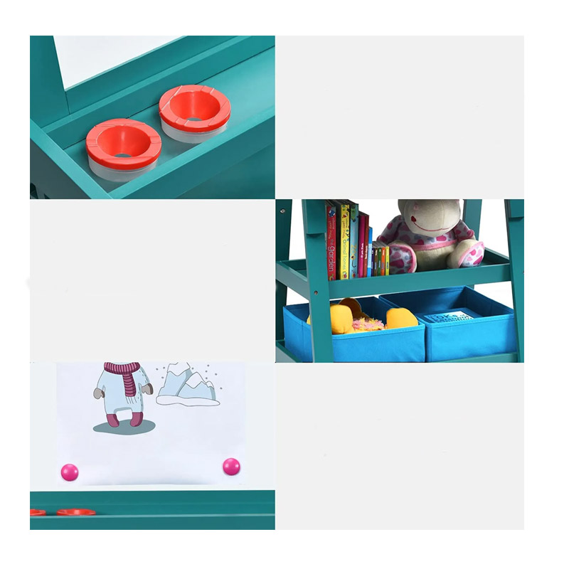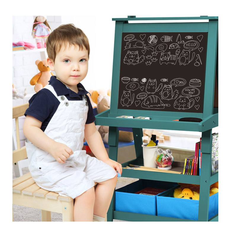 Διαθέτει διπλή όψη για γραφή με κιμωλία από τη μία πλευρά και με μαρκαδόρο από την άλλη. Μπορείτε επίσης να ξετυλίξετε το χαρτί από το ρολό προς τα κάτω και να το στερεώσετε με δύο μαγνήτες για να μπορείτε να ζωγραφίσετε πάνω του. Υπάρχει ένα ράφι κάτω από την επιφάνεια σχεδίασης σε κάθε πλευρά, το οποίο προσφέρει άφθονο χώρο για μαρκαδόρους. Έχει επίσης δύο ράφια στο κάτω μέρος τα οποία μπορείτε να φτάσετε και από τις δύο πλευρές.