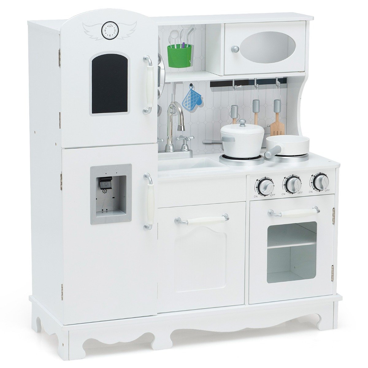 - Στυλάτη και ρεαλιστική εμφάνιση: Το σετ κουζίνας θα μαγνητίσει τα παιδιά με την πρώτη ματιά. Περιλαμβάνει νεροχύτη, προσομοιωμένο φούρνο, πρακτικά ντουλάπια, ψυγείο, διανομέα νερού με ρεαλιστικό φως και ήχο, vintage τηλέφωνο και άλλα αξεσουάρ κουζίνας (1 κατσαρόλα με καπάκι, 1 τηγάνι, 3 ξύλινα μαγειρικά σκεύη). Ιδανικό για φανταστικό παιχνίδι.