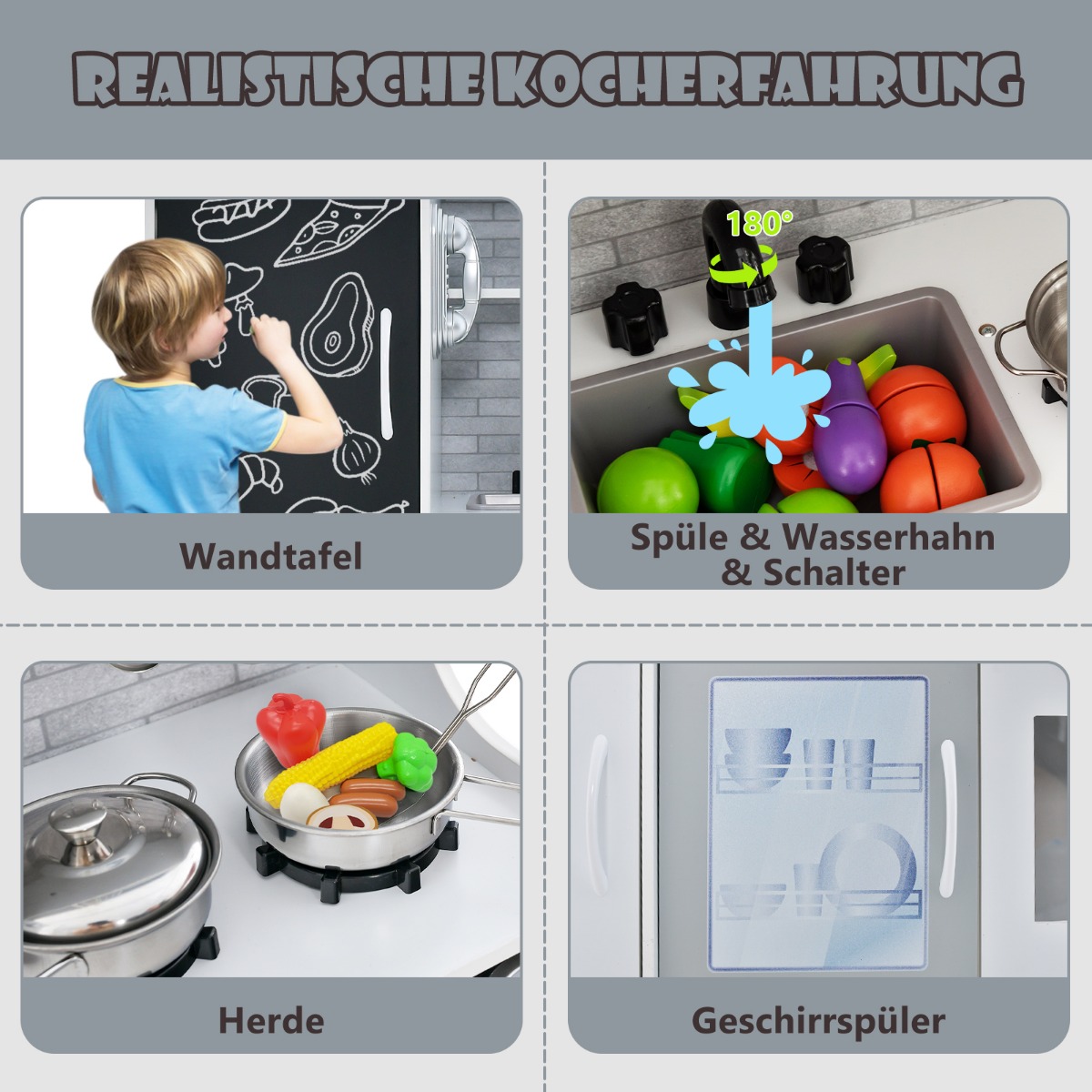 Η παιδική κουζίνα διαθέτει φούρνο μικροκυμάτων, νεροχύτη, εστίες, παγομηχανή, πλυντήριο πιάτων και φούρνο, προσφέροντας στα παιδιά μια καθηλωτική εμπειρία κουζίνας. Επιπλέον, ο πίνακας και το τηλέφωνο προσφέρουν επιπλέον διασκέδαση. Ρεαλιστικοί ήχοι είναι διαθέσιμοι με την περιστροφή των κουμπιών. Τα παιδιά μπορούν να αναπτύξουν τις δεξιότητές τους, τη φαντασία και τη δημιουργικότητά τους μέσω του παιχνιδιού ρόλων.